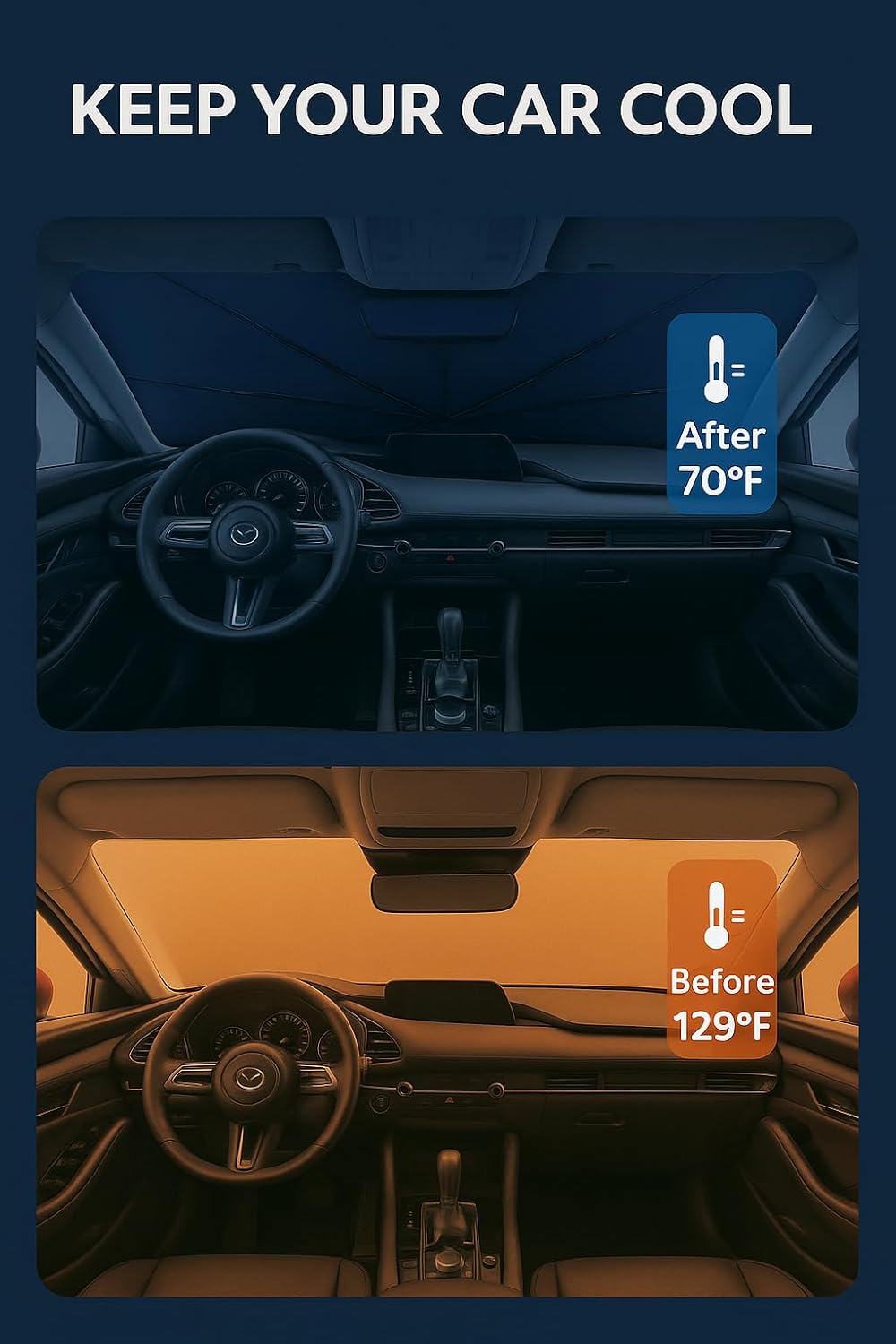 - Certified Sustainable. Customized Windshield Sunshade: Specially designed for the 2020-2025 Mazda CX-30 with precise mirror cutouts, providing 100% shading, carbon fiber handle, ensuring lightweight and durability while also having a fashionable feel. Our CX-30 windshield sunshade can protect the interior of your car from various light damage and prevent dashboard and seat degradation.