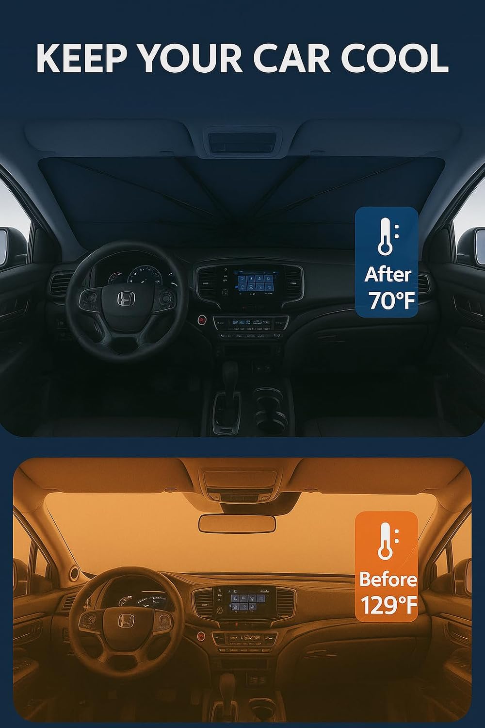 - Certified Sustainable. Customized Windshield Sunshade: Specially designed for the 2017-2025 Honda Ridgeline with precise mirror cutouts, providing 100% shading, carbon fiber handle, ensuring lightweight and durability while also having a fashionable feel. Our Ridgeline windshield sunshade can protect the interior of your car from various light damage and prevent dashboard and seat degradation.