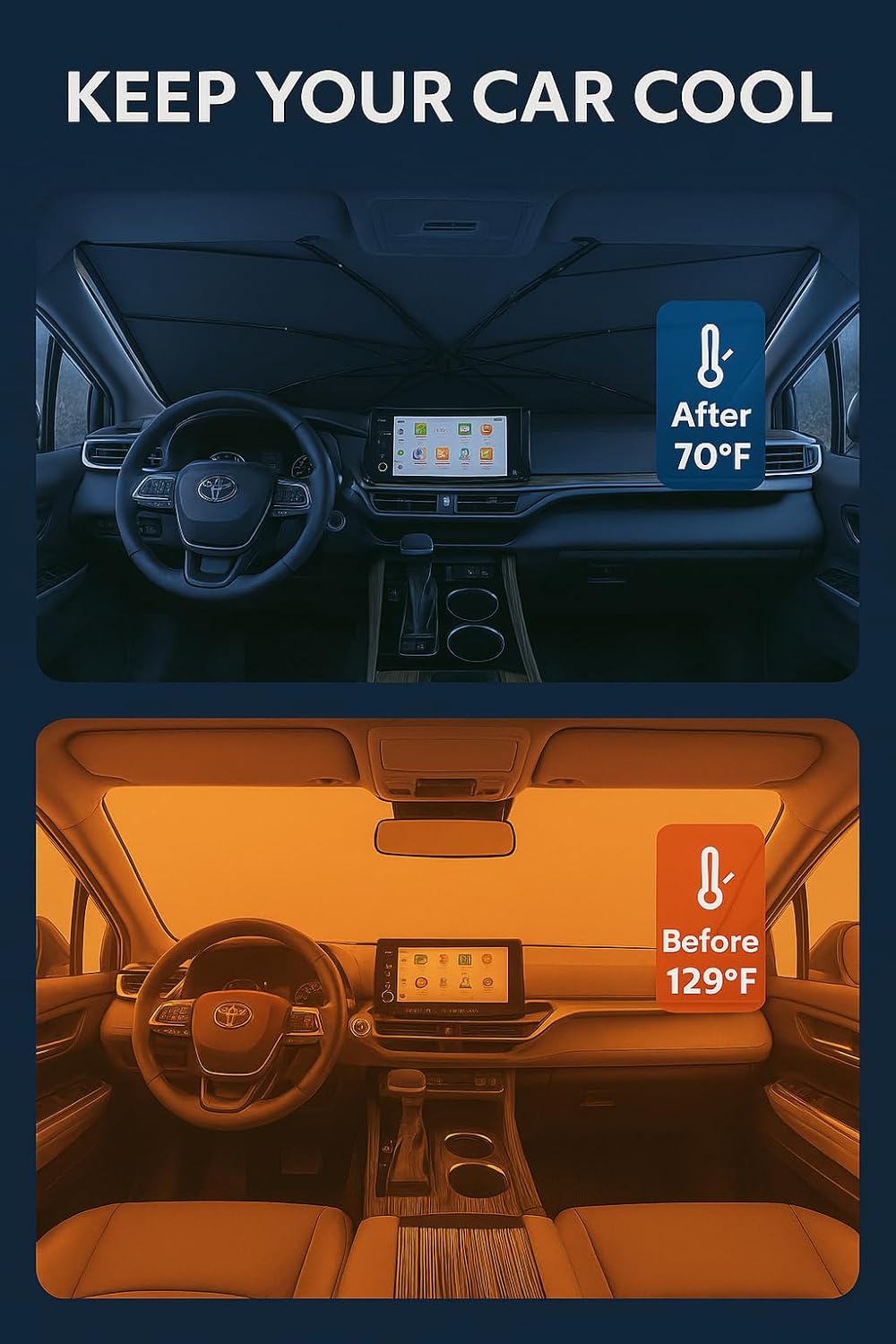 - Certified Sustainable. Customized Windshield Sunshade: Specially designed for the 2021-2025 Toyota Sienna with precise mirror cutouts, providing 100% shading, carbon fiber handle, ensuring lightweight and durability while also having a fashionable feel. Our Sienna windshield sunshade can protect the interior of your car from various light damage and prevent dashboard and seat degradation.