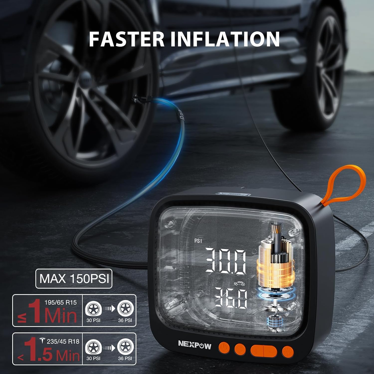 - 150PSI Faster Inflation Speed: The maximum pressure of the NEXPOW NP19 portable tire inflation pump is 150PSI, with an inflation rate of 22 liters per minute. Inflate standard car tires (195/55 R15) from 30 PSI to 36 PSI in less than a minute, and inflate Tesla tires (235/45 R18) from 30 PSI to 36 PSI in less than 1.5 minutes. Easy to operate and quickly inflate. Attention: After running continuously for a period of time, the portable air compressor should be allowed to cool for 10 minutes.