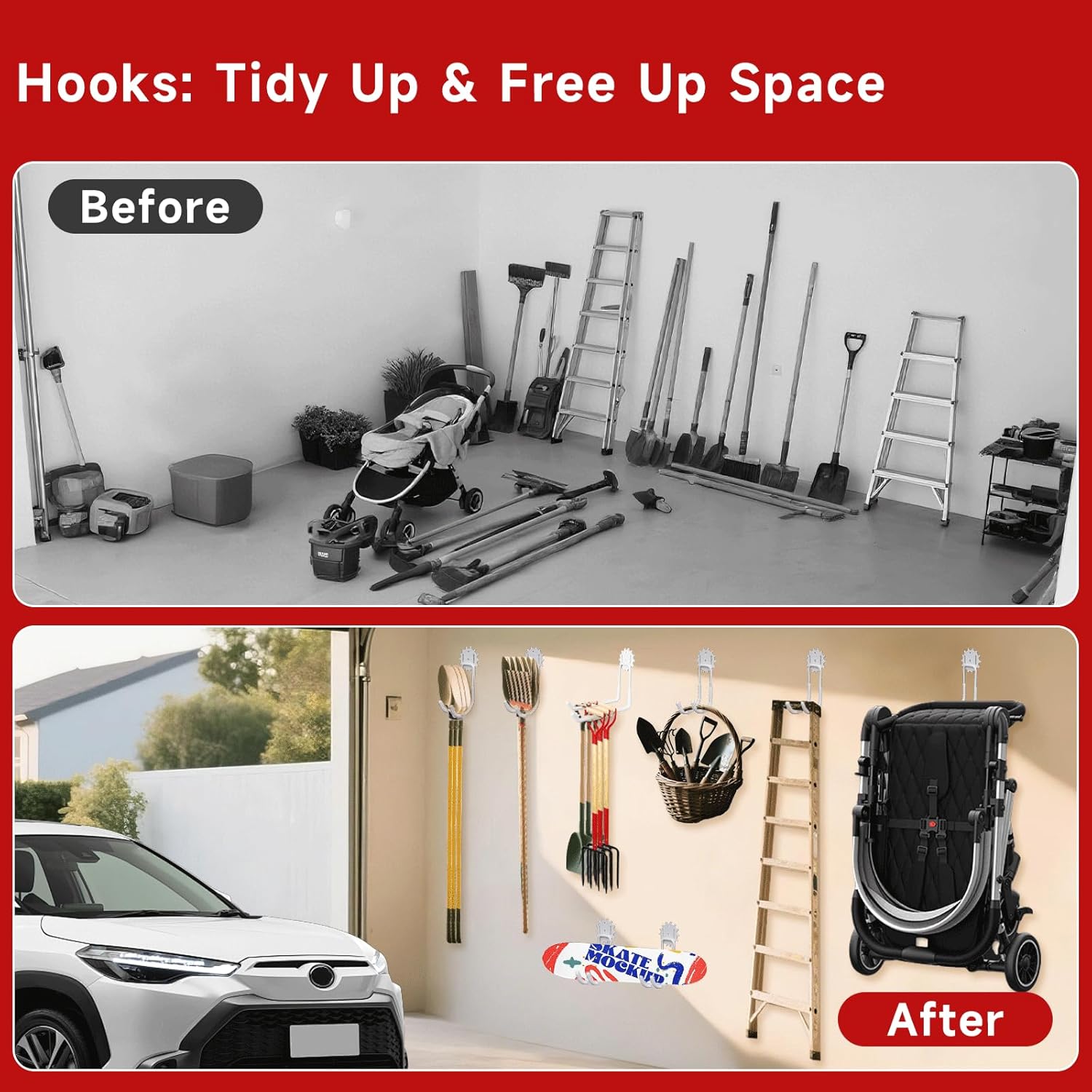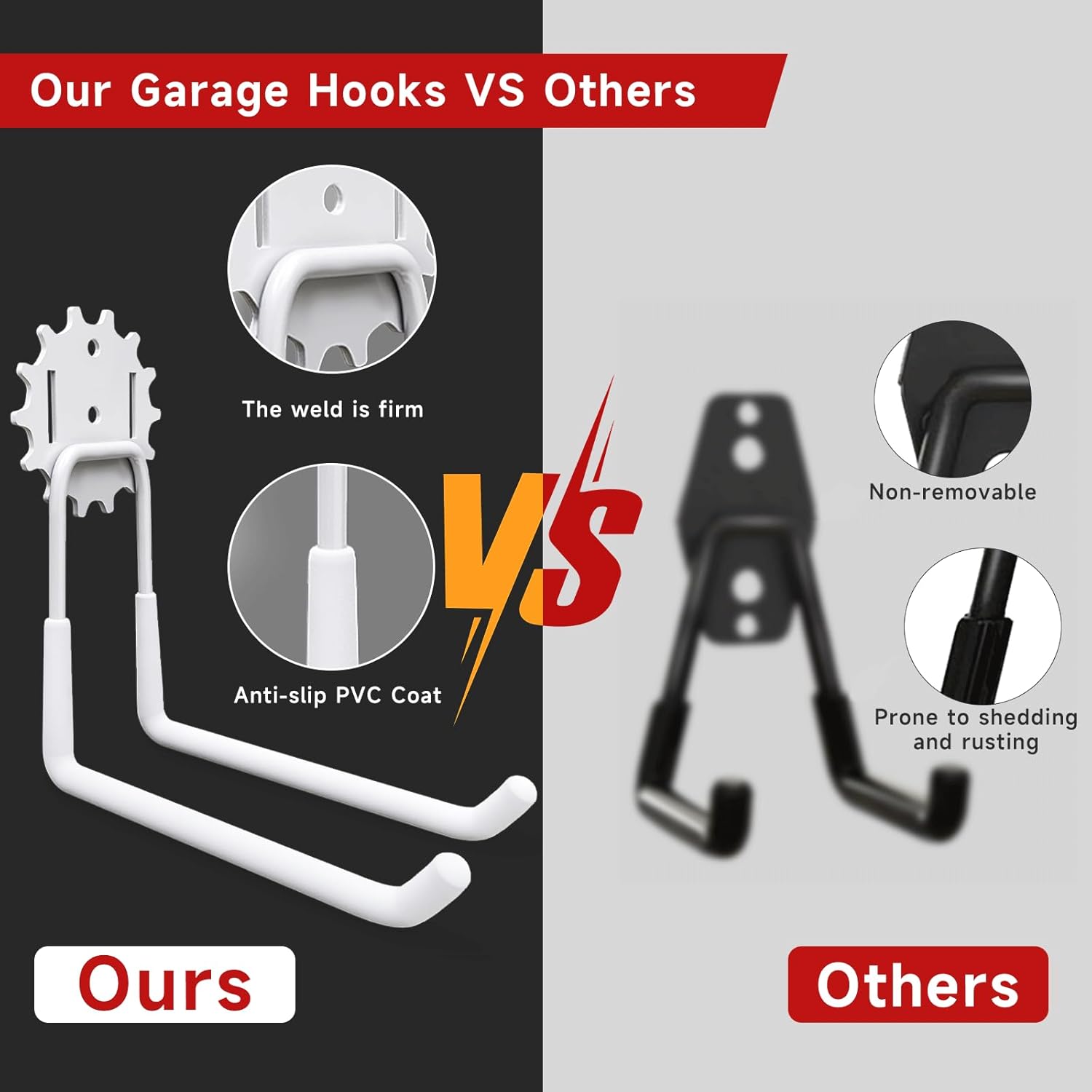 - Efficient Storage: Vehookin white garage hooks are suitable for organizing various spaces and can hang heavy items such as ladders, garden tools, power tools, bikes, shovel, broom, scooter, weed eater,or bulk items in everywhere you need, such as garage, shop, shed, garden, warehouse, basement,etc
