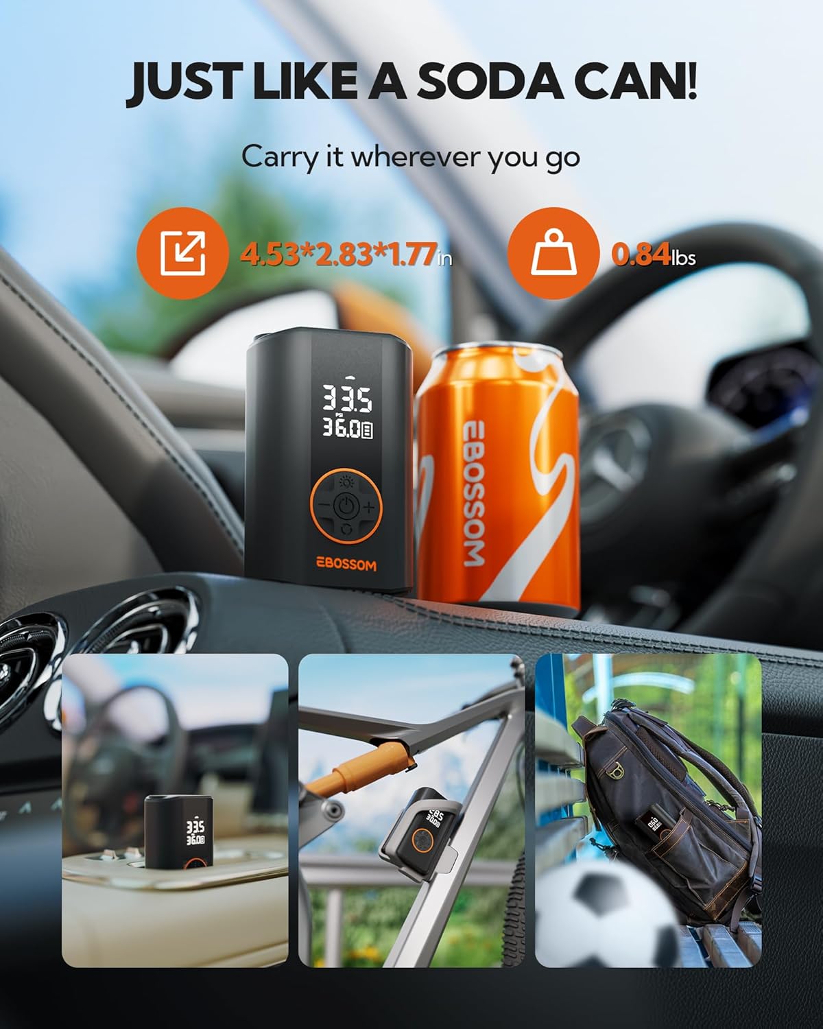 - Soda Can Size & Travel-Ready: Roughly the size of a soda can (4.53×2.83×1.77 in, 0.84 lbs), this portable bike pump fits in your glove box or backpack. Includes a storage pouch for all attachments. A must-have tire pump for car portable enough for travel, cycling, hiking, or emergency use. Small, but powerful
