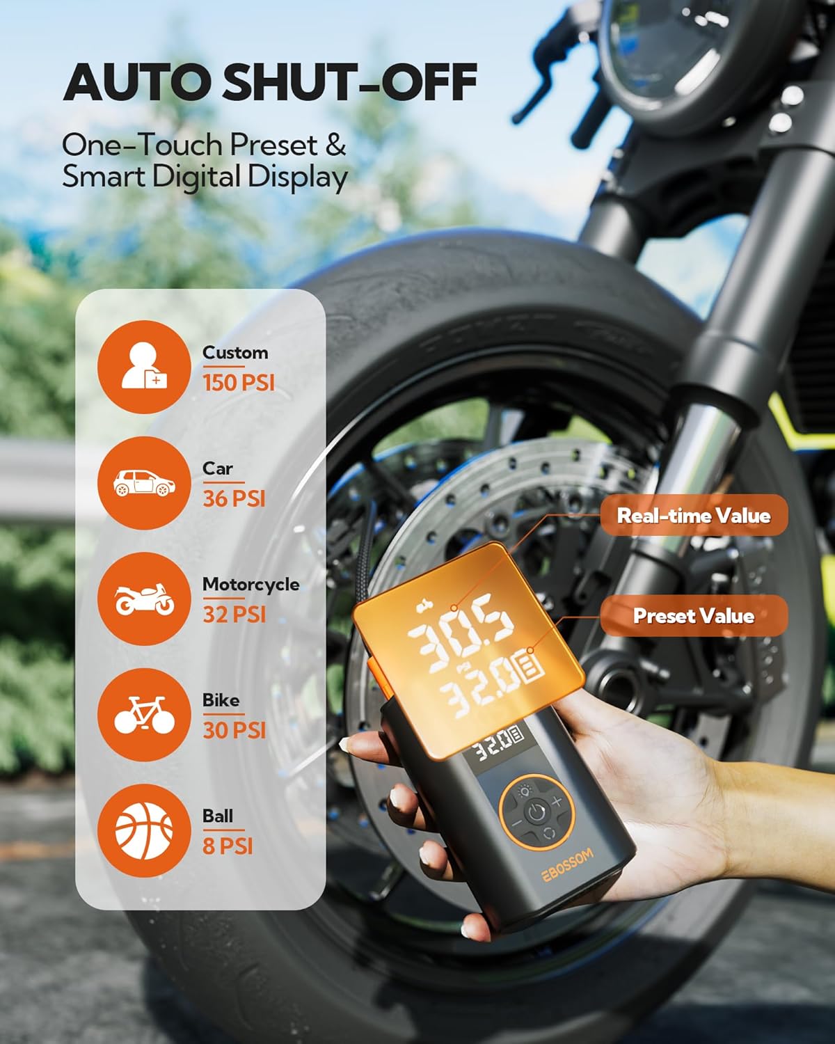 - Smart Operation & Auto Shut-Off: About to bike to the park and find a flat? This air pump for bike and car auto-detects pressure. Just connect, press start, and it handles the rest. This air pump also provides you with rest-assured using experience based on the auto shut-off function at the pressure value you set with a pinpoint precision of ±0.5PSI. There is no need to worry about over-inflating