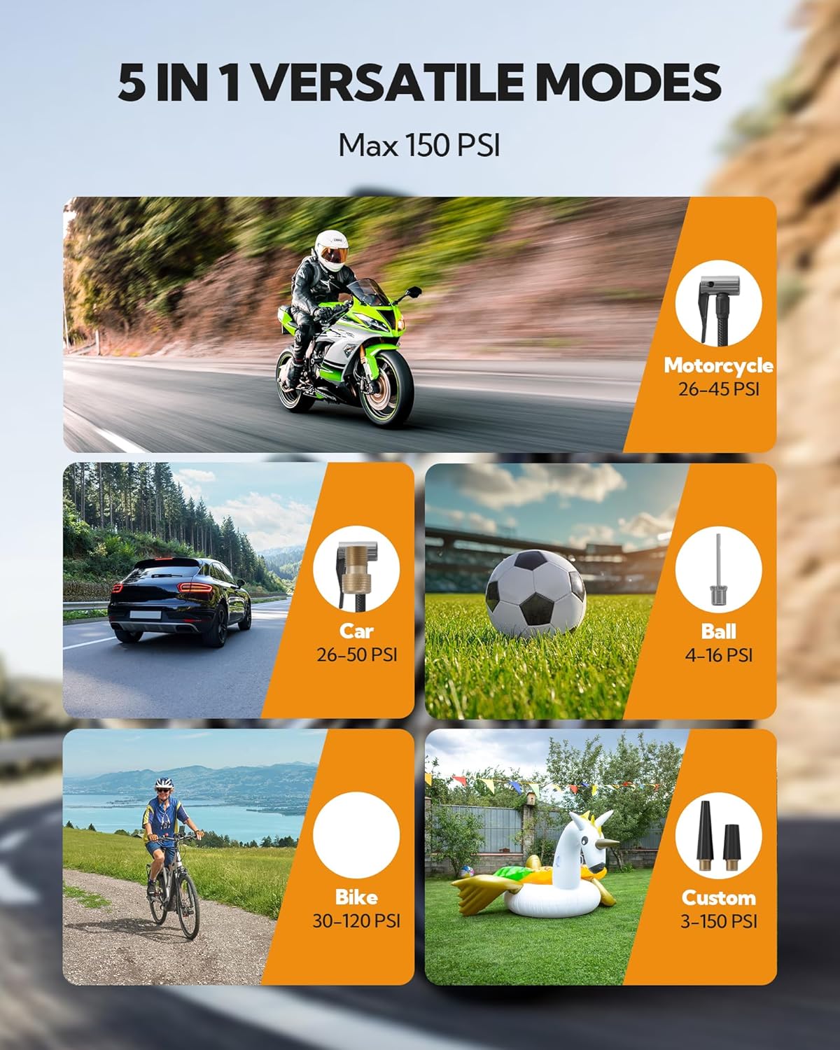 - 5 Modes & 4 Pressure Units: Tired of hand-pumping inflatables?This smart portable air pump has 5 preset modes for cars, motorcycles, bikes, sports balls, and custom items, it covers all your daily and recreational inflation needs with 150 PSI power. And the portable air pump supports 4 pressure units: PSI, KPA, BAR, and KG/CM². Easily press the conversion button below to change the units—perfect for any inflation task