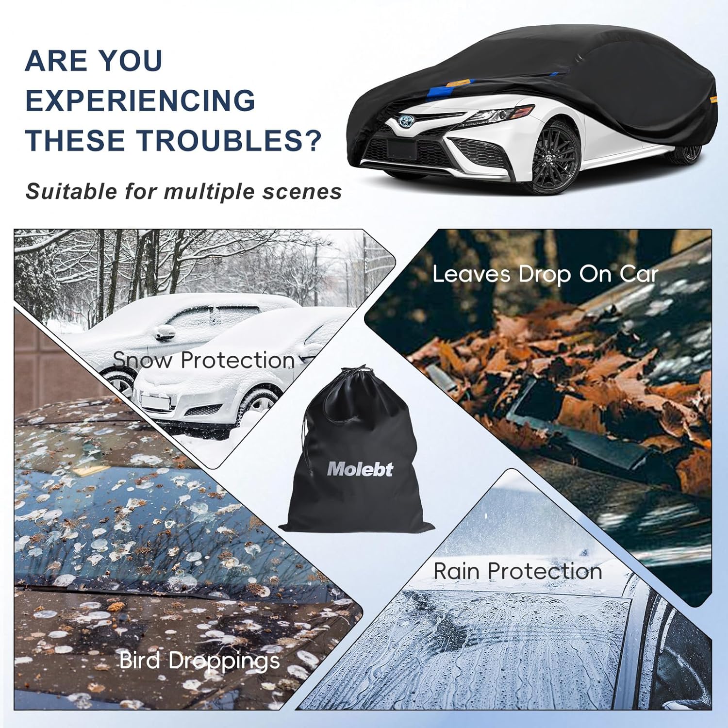- 【Innovative Design: Safety and Practicality】 Molebt Car Cover is equipped with 6 high-visibility reflective strips, enhancing visibility at night or in low-light conditions to ensure vehicle safety. The bottom features 3 pairs of windproof straps to prevent the cover from being lifted by strong winds. Elastic hem ensures a snug fit, shielding against dust and rain.Your purchase includes: A storage bag for easy folding and Space-saving .