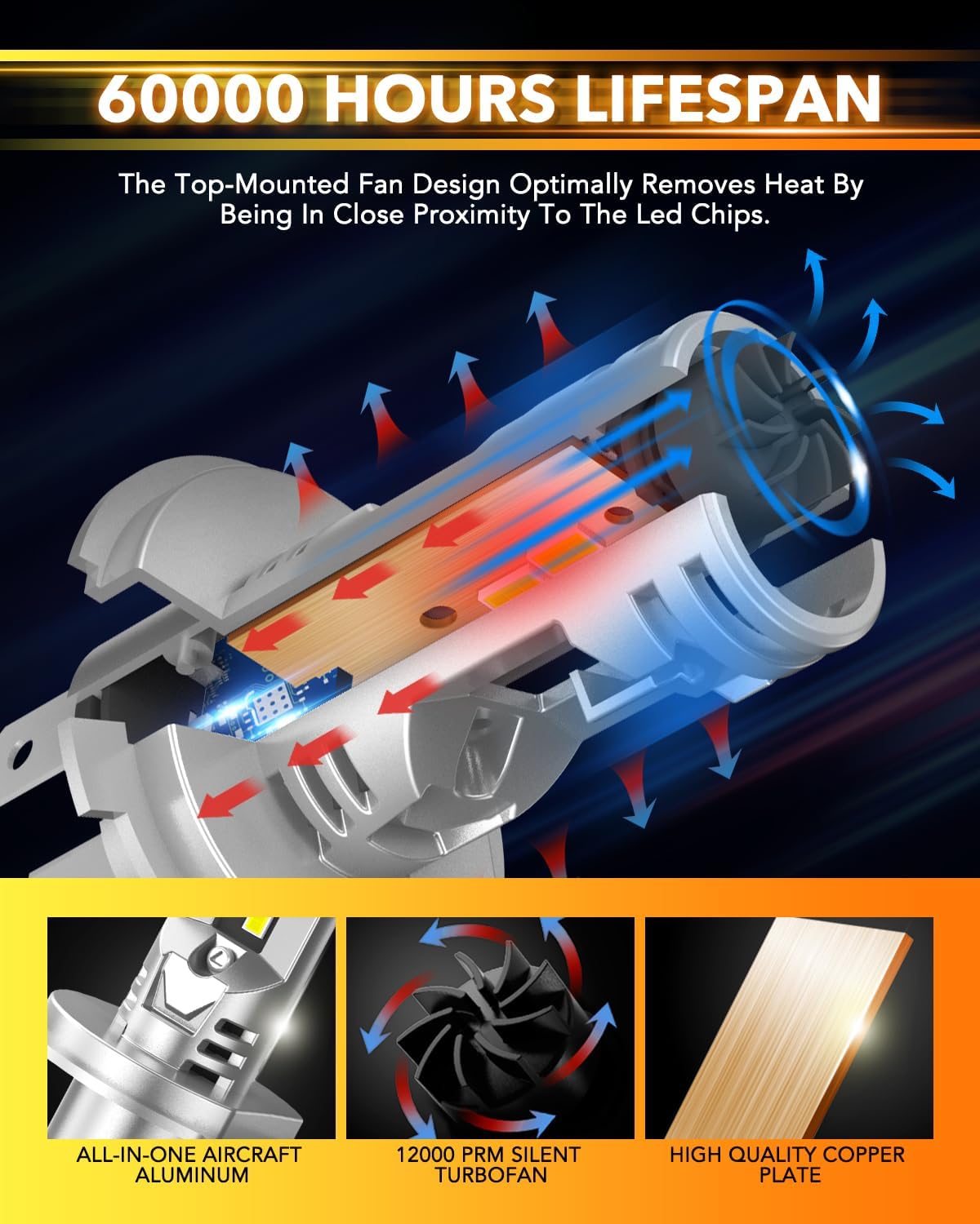 - 【Built-in CANbus for Compatibility】Featuring a built-in CANbus system, these H4 bulbs are compatible with 99% of vehicle systems. Enjoy flicker-free, error-free performance, with minimal radio interference and no dashboard error codes.