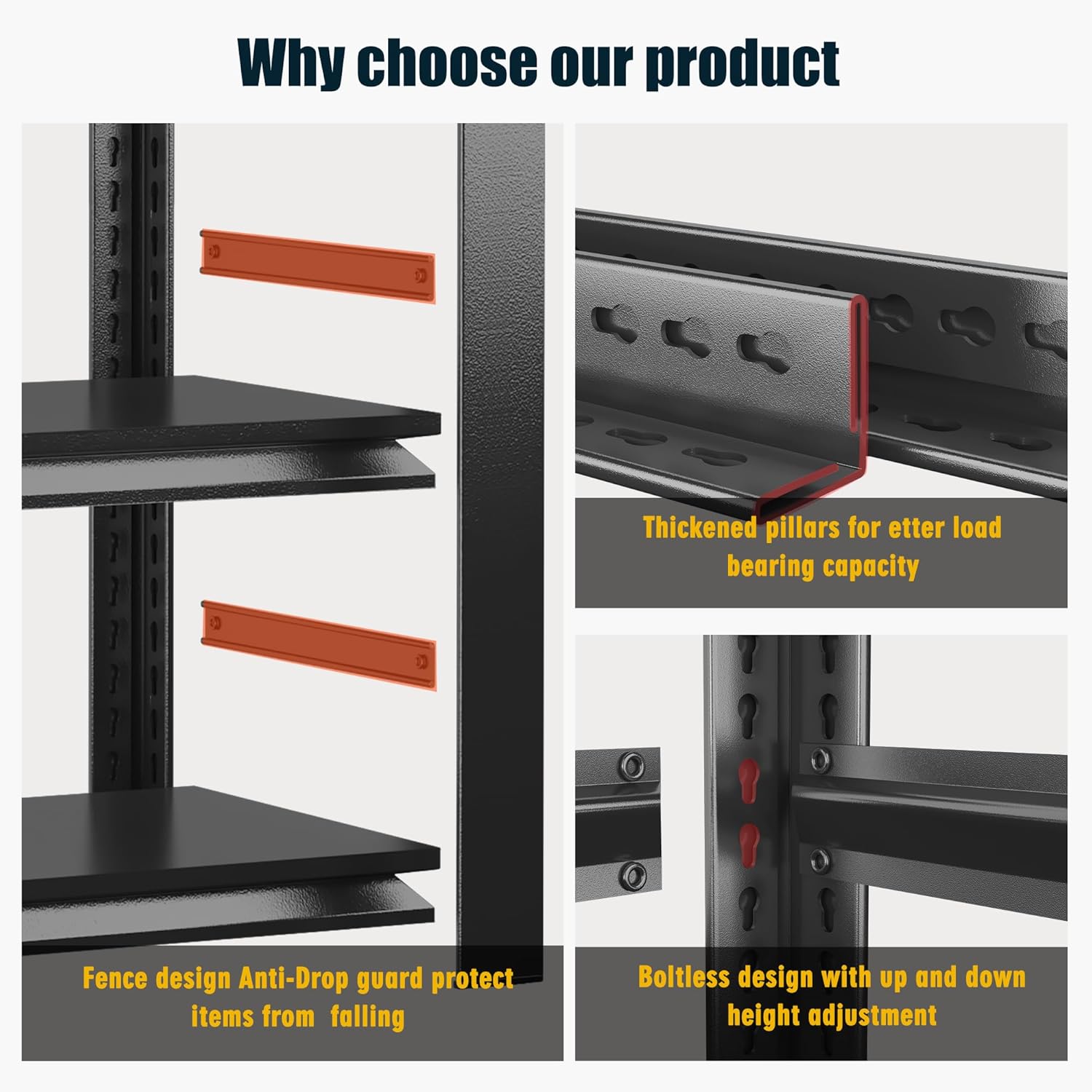 - 【Extremely Sturdy & Durable Garage Shelving】Constructed from high-strength premium cold-rolled steel with advanced powder-coated technology, this metal shelving unit resists rust, oxidation, and wear. The industrial-grade coating not only enhances aesthetics but also boosts durability, making it a heavy duty garage shelving solution for long-term use