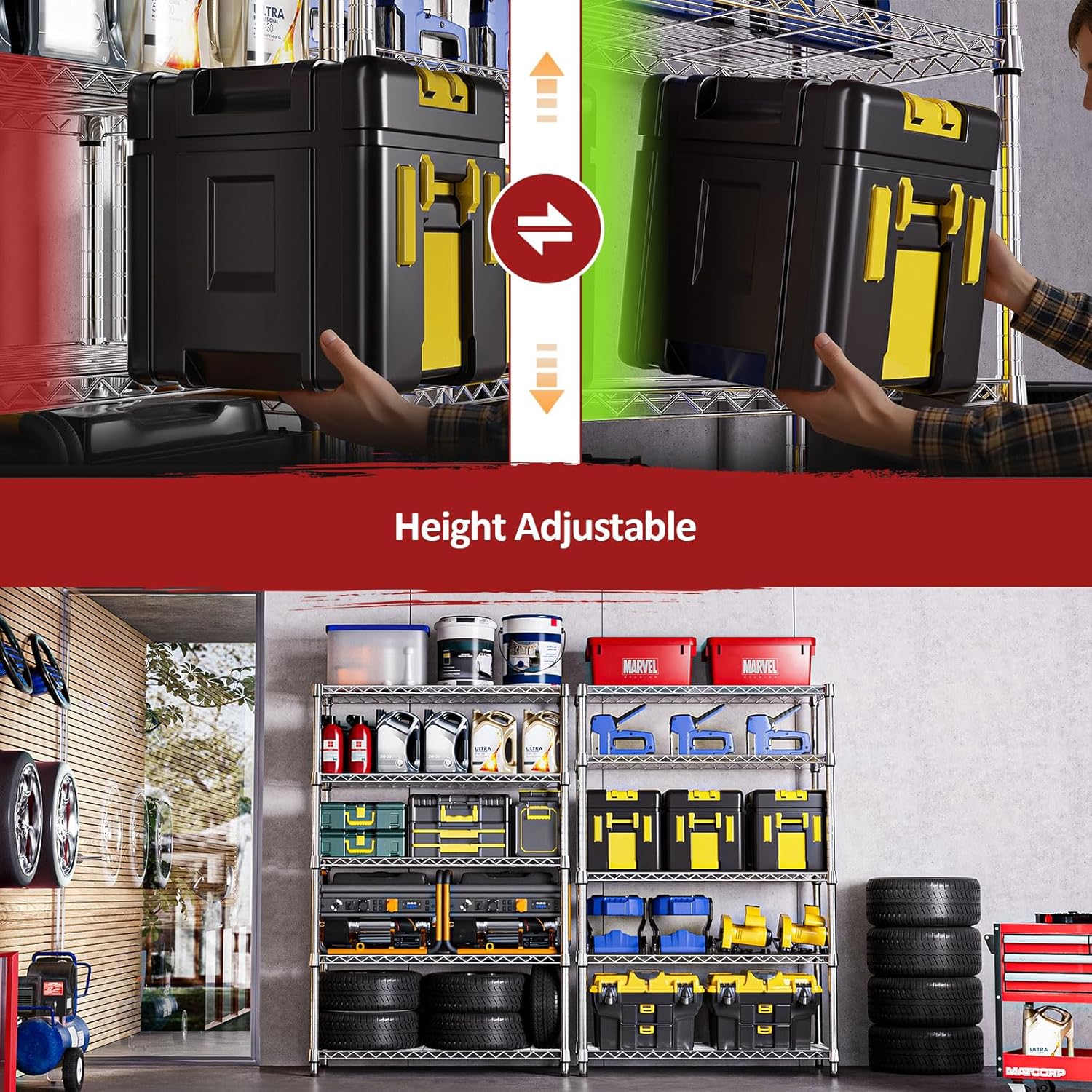 - 【Adjustable Shelves – Flexible for All Needs】Customize your storage your way. Each shelf can be easily adjusted in 1-inch increments to fit items of varying sizes—from bulky tools to compact kitchenware. This wire shelving unit adapts to your unique storage needs, creating a more organized and efficient space.