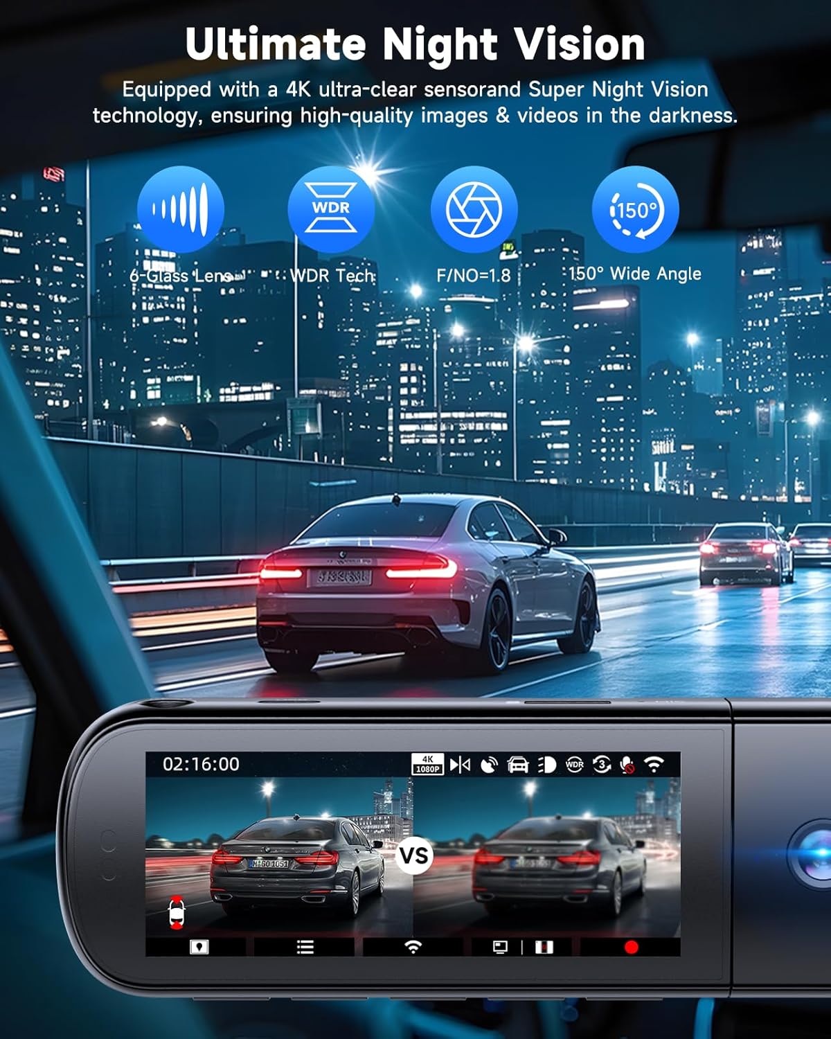 - [4K Dash Cam Front and Rear] This ultra-clear dash cam for cars equipped with 4 IR lights, fast F1.8 aperture, and 6-layer glass lens, allowing for simultaneous 3-channel recording without any blind spots to enhance your driving safety. Featuring WDR (Wide Dynamic Range) technology, this dash cam effectively balances strong light and backlighting. Its advanced night vision capability guarantees clear & sharp images, day or night.