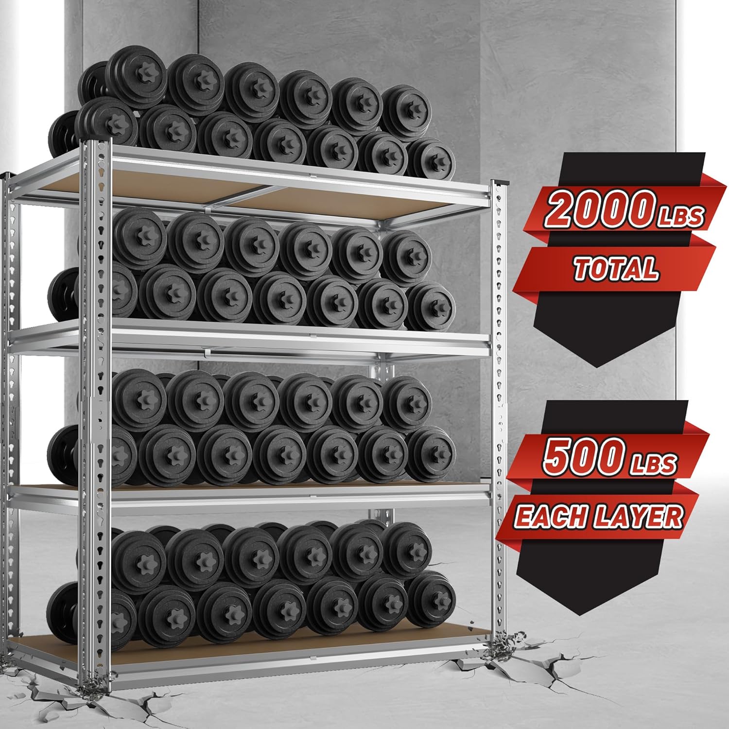 - 【2000LBS Capacity Storage Shelves】The heavy duty shelving has thickened metal frame, rolled edge and 5mm wood board,each metal shelves with big ribs beneath can hold up to 500 lbs, with a total bearing capacity of 2000 lbs, which makes garage shelves more sturdy and more stuff can be stored