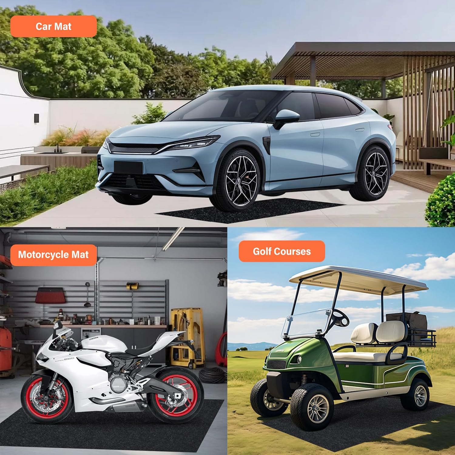 - MULTIPURPOSE: Garage mat's size is 60" x 36". Our rubber mats for floor is tear and abrasion resistant, durable and reusable;It is great for vehicle oil changes and repairs;Garage floor mats can also be used for car trunks, cabinets, gardening tools, harvesters, pet gear, etc