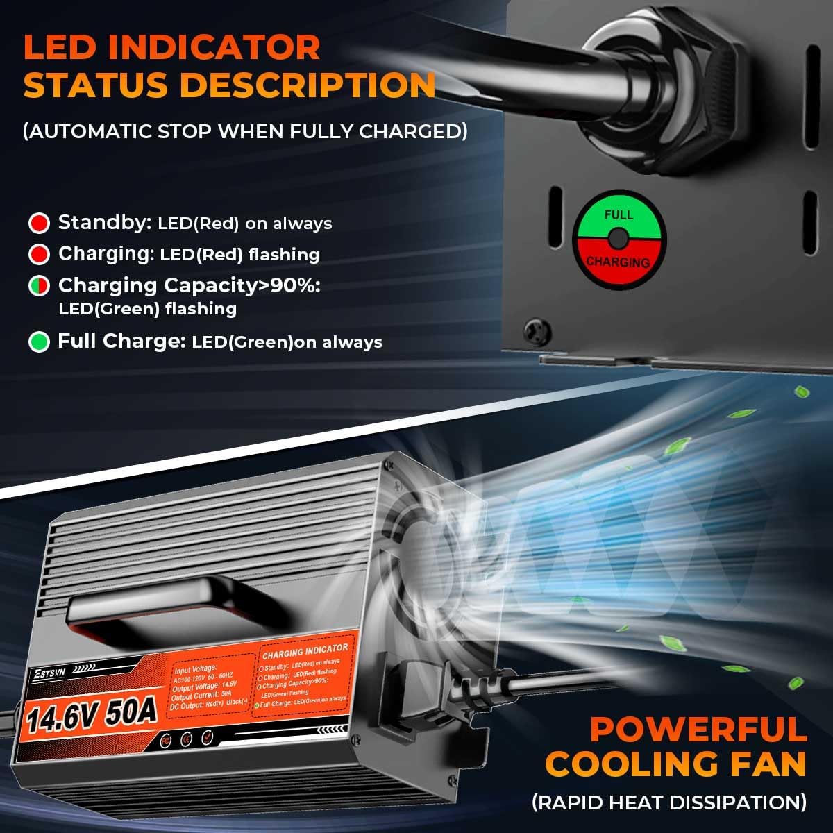 - 🪁【Lightweight and Compact】: Our 12V 50A lithium battery charger with handle is easy to carry and weighs only 5.4 pounds, so you can take it wherever you need to charge,features more abrasion and heat-resistant rubberized cords,and LED indicators show the status of each stage of charging.Safe and easy to use.