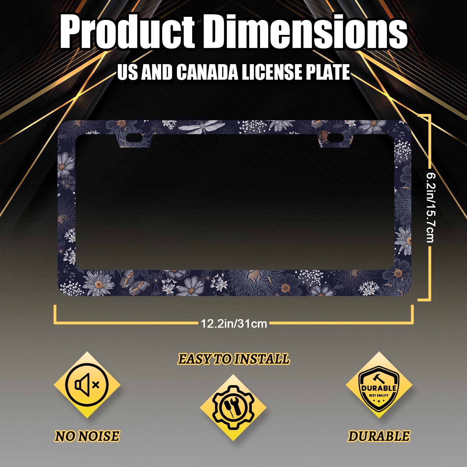 - Size: The size of the license plate frame is 12.3" x 6.3" , it fits all standard size US and Canada vehicle license plates.Fashion design frame fits perfectly on your car license plate.