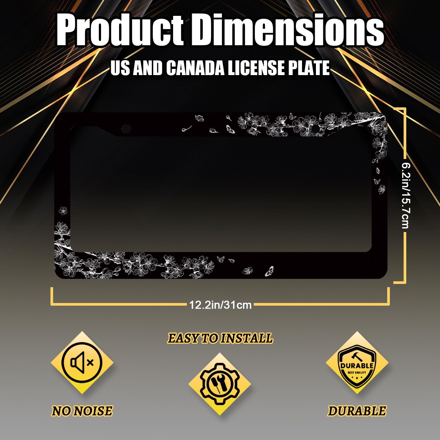 Black White Cherry Blossom License Plate Frame Butterfly Flower License Plate Holder Stainless Steel Car Accessories Decoration 6.3"X12.3" with 2 Holes Screws