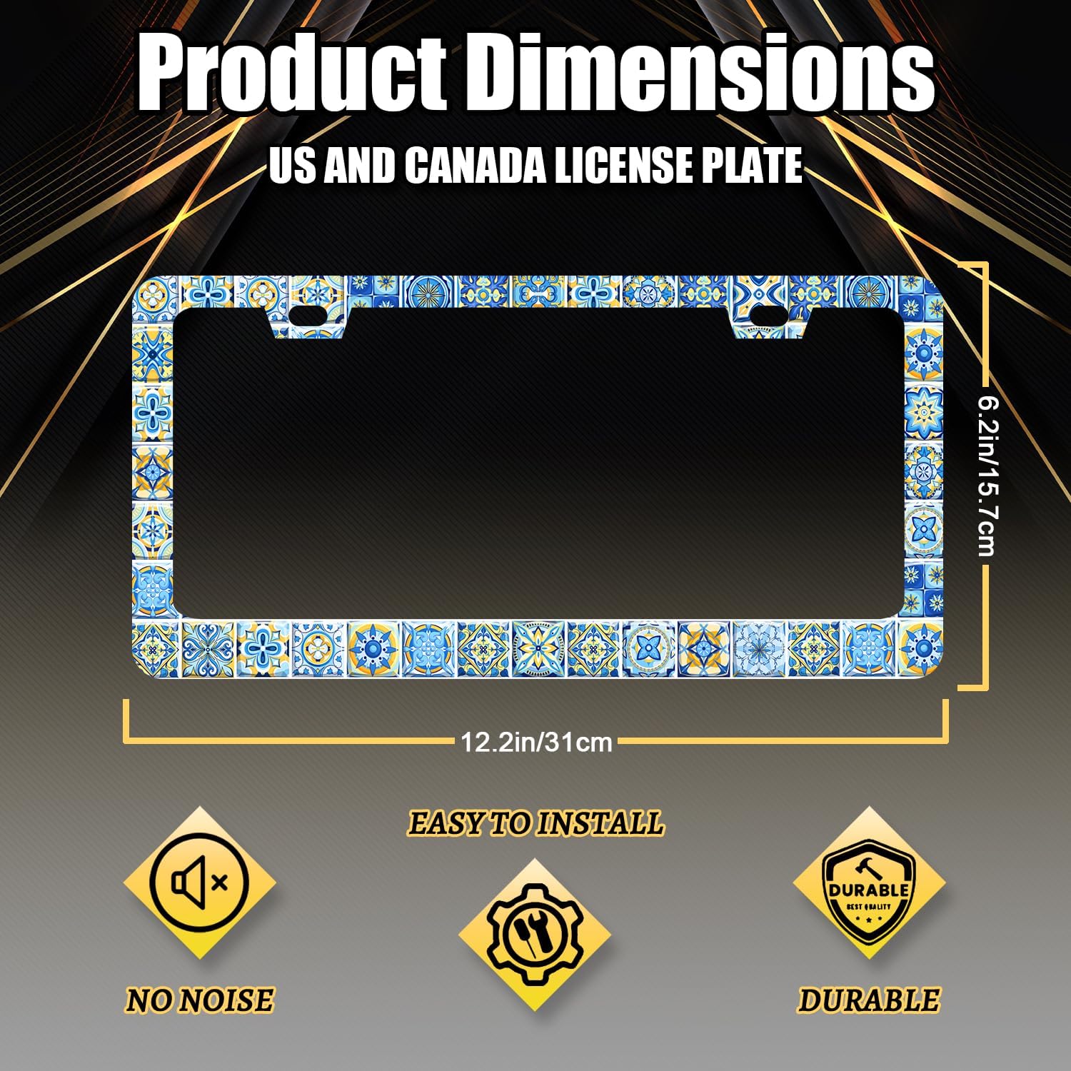 Blue White Mexican Tiles License Plate Frame Boho License Plate Holder Stainless Steel Colorful Car Accessories Decoration 6.3"X12.3" with 2 Holes Screws