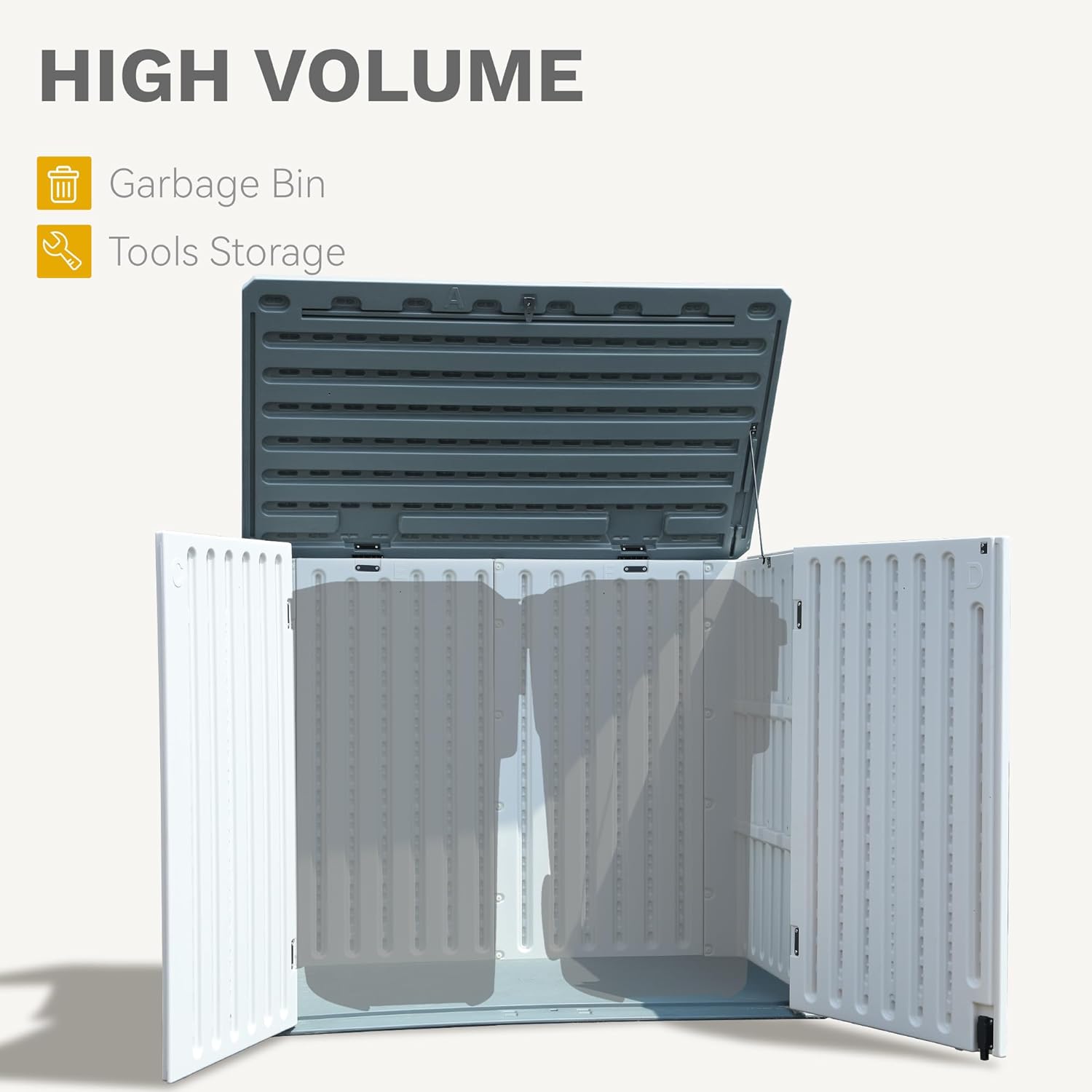 - Spacious Storage Capacity: This plastic storage shelter offers a generous 47 cubic feet of space, suitable for lawnmowers, bicycles, garden furnishings, or two trash receptacles; Expand your storage potential by adding an additional laminate shelf (50.5x23.8 inches, not included)