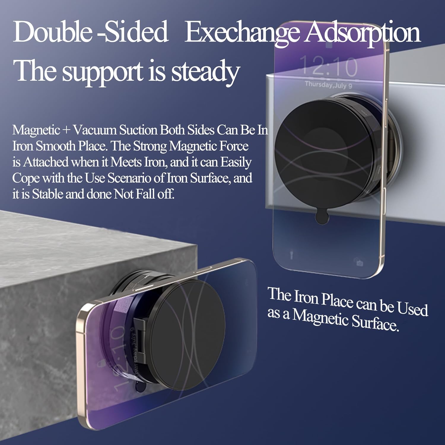 - 【Powerful Vacuum Suction Cup Phone Holder】The vacuum magnetic phone holder uses advanced vacuum adsorption technology to achieve hands-free operation on smooth surfaces. It can be firmly adsorbed even if it is dirty, and the adsorption is firm and leaves no traces. It can flexibly adapt to your usage needs. Whether it is cooking or bathing, it can provide unparalleled convenience and support, freeing your hands and enhancing your daily life experience. However, IT SHOULD BE NOTED THAT this vacuum magnetic phone stand CAN ONLY BE ATTACHED TO MIRROR SURFACE WHEN THE INCLUDED ROUND PC PAD IS NOT IN USE; additionally, the product may NOT PERFORM AS EFFECTIVELY IN REGIONS WITH EXTREMELY CLIMATES.