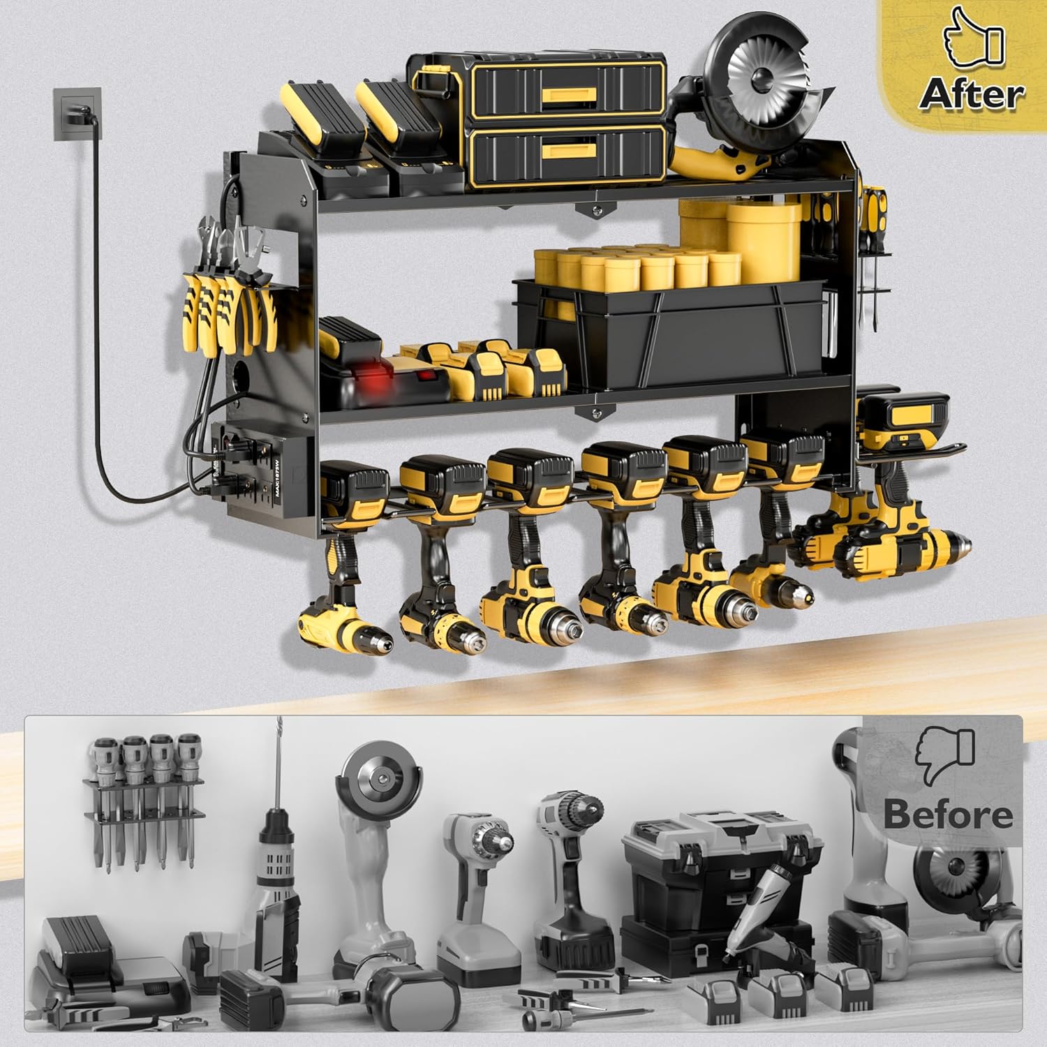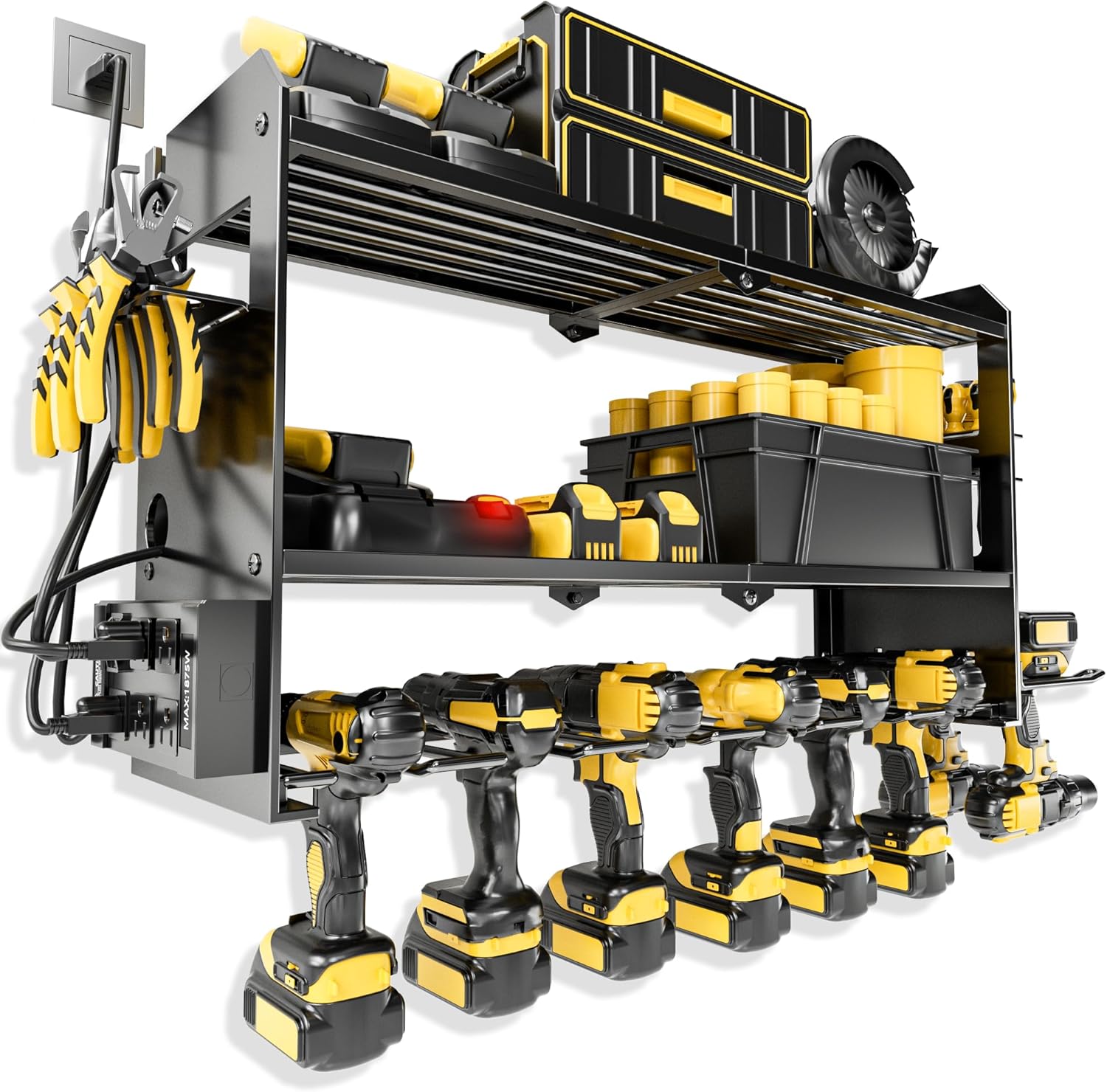 - 【9.4-inch mid-tier and more Storage】This power tool organizer features the lastest high capacity design,The 9.4-inch mid-tier tool rack can hold more larger power tools and charging stations and large toolboxes,batteries,making it your all-in-one solution