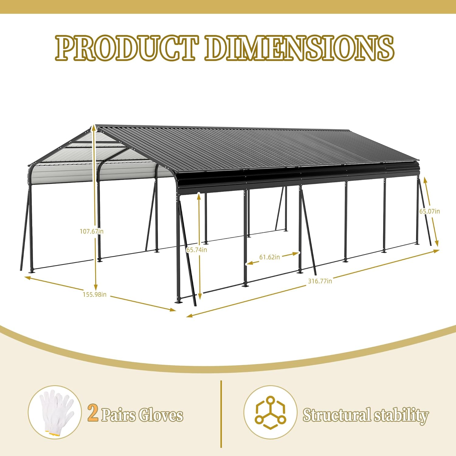 - ✅ 𝐀𝐥𝐥‑𝐖𝐞𝐚𝐭𝐡𝐞𝐫 𝐂𝐚𝐫𝐩𝐨𝐫𝐭: Sized at 13 × 26.5 ft, this metal carport provides year-round protection for your car, boat, and outdoor gear against wind, rain, and snow. Protruding eaves combined with rainproof tape seal out leaks during heavy downpours. Say goodbye to parking headaches under reliable, all-season heavy duty car ports.