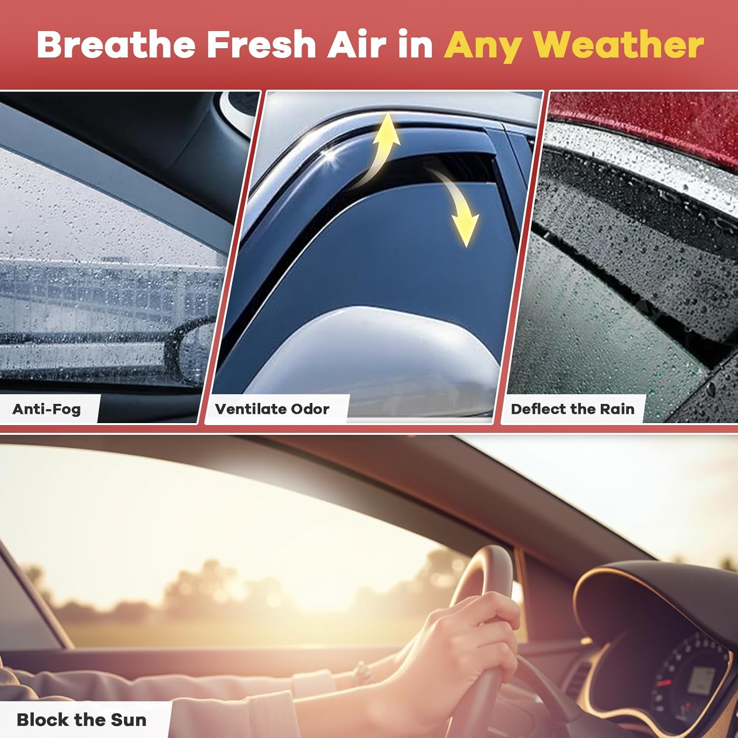 - 【Improved Ventilation and Air Flow】Allows fresh air to circulate through open windows while keeping the rain out or reduces heat. Reduce mirror and window fogging; reduce sun glare through side window. Dark Smoke translucent color will not obstruct the driver's view while driving