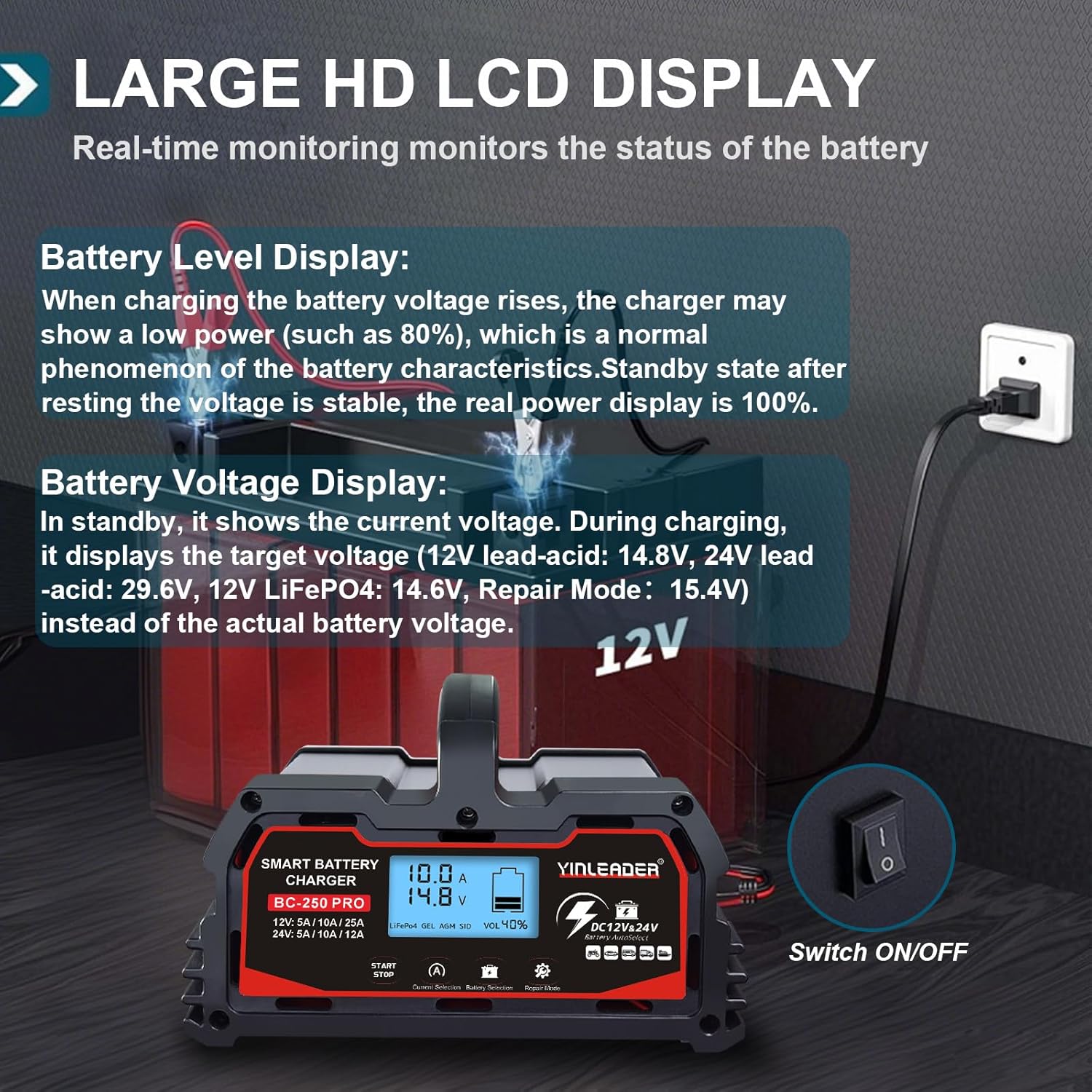 - Wide Range of Applications: It offers a variable charging current of (12V-5A/10A/25A)/(24V-5A/10A/12A) and 12V-LifePO4 battery charging, allowing you to choose the appropriate current for your battery size. Suitable for charging and repairing lead-acid batteries, including AGM, STD, GEL, SLA, etc, in cars, trucks, SUVs, motorcycles, lawnmowers, boats, and more.