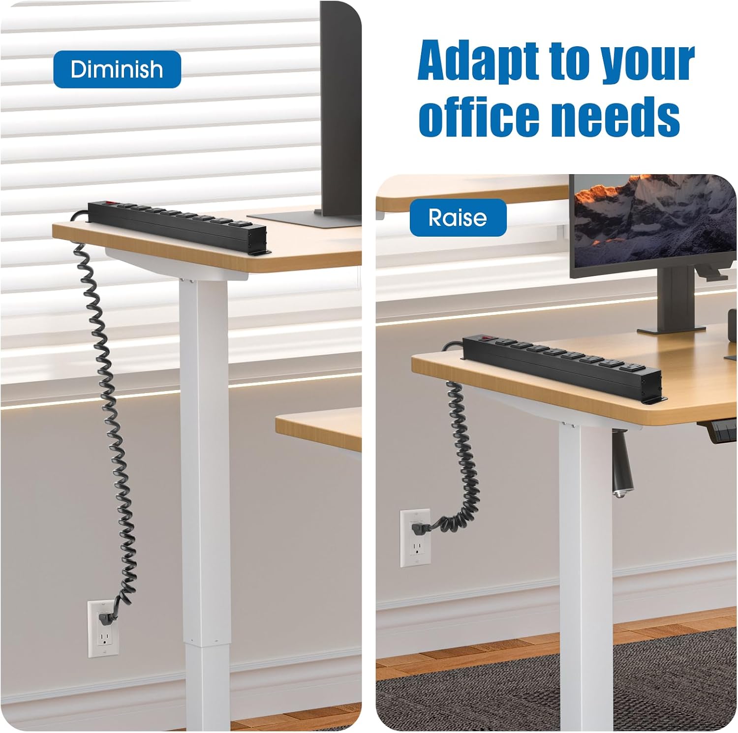 - Spring Cord Power Strip: Equipped with a 10 foot spring-loaded cord to keep things neat and organized while extending the length of the power cord, perfect for height-adjustable standing desks and your other needs.