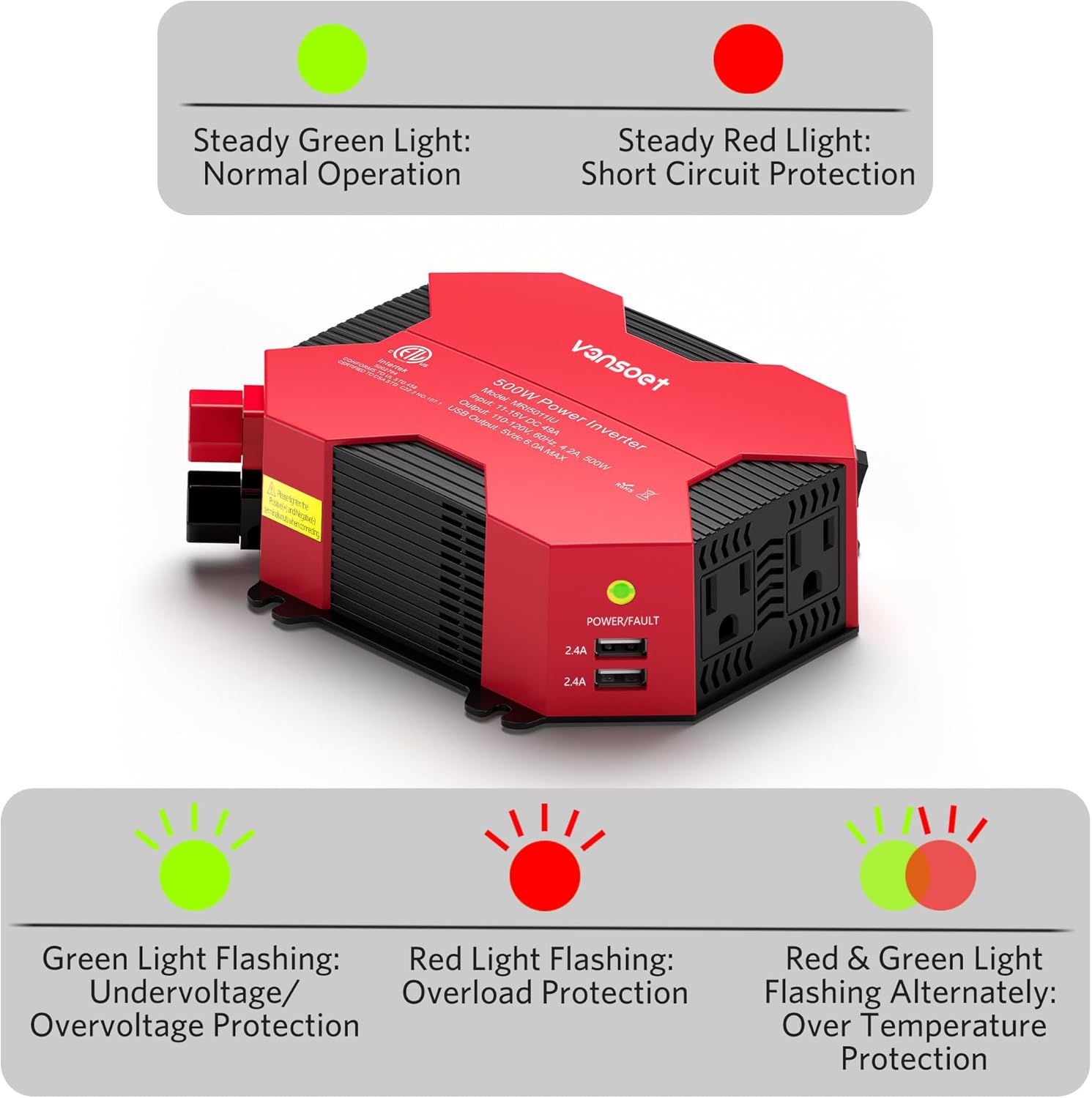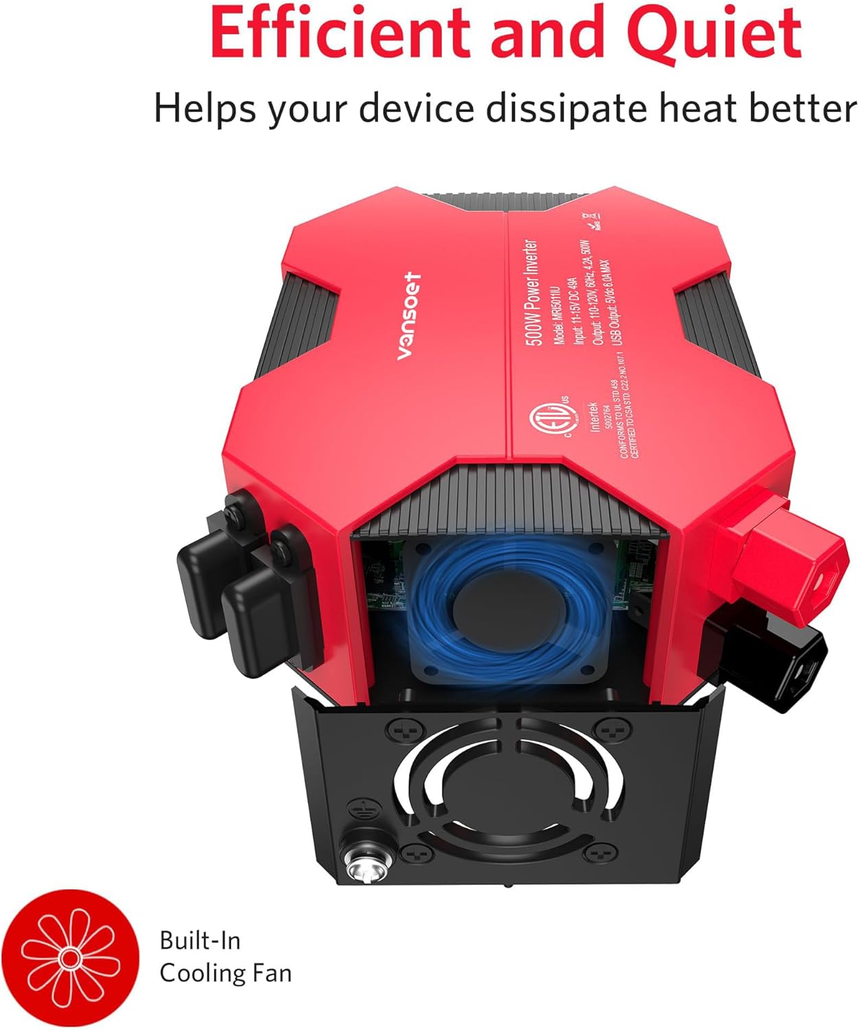 - Vansoet Advantage:power inverterProvides 500W continuous DC to AC power and 1000W instantaneous power, featuring 2 AC outlet and 4 USB charging ports. Durable metal housing provides advanced protection from drops and bumps.