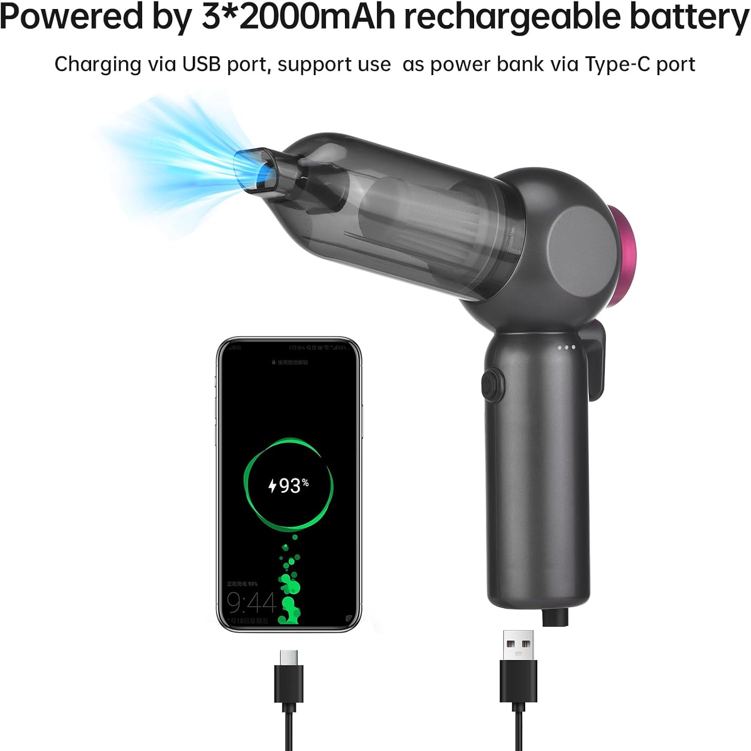 - 【Two Different Charging Interfaces】The car vacuum portable cordless is equipped with a built-in 3 * 2000mAH battery, which is rechargeable and reusable, making it more environmentally friendly and energy-efficient. The 6-in-1 car vacuum cleaner has two different charging ports. One uses a Type-C data cable to charge the vacuum cleaner, and the green indicator light can promptly remind you that the battery is fully charged. A USB charging cable that can be plugged in to connect the other end to a device that needs to be charged, such as a phone, tablet, etc.