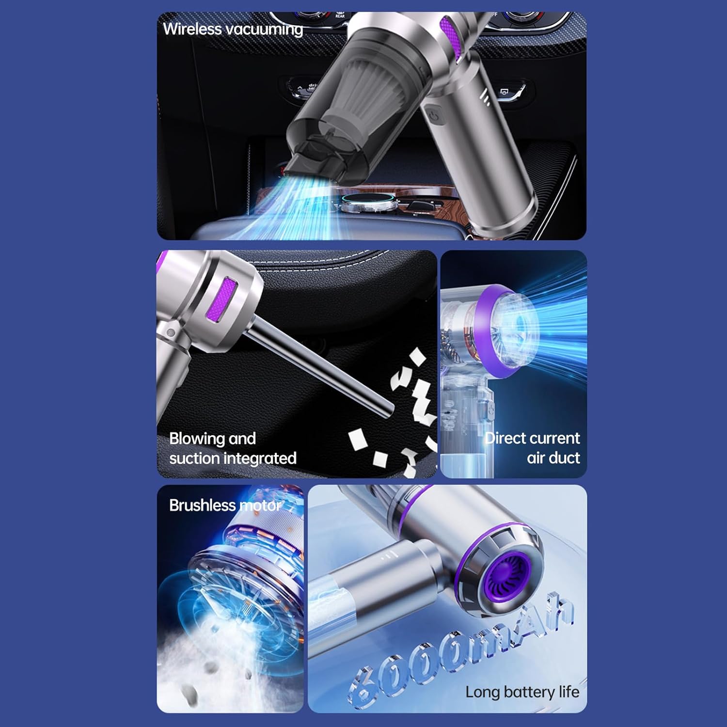 - 【16000PA Car Vacuum Cleaner】 This car vacuum cleaner is equipped with an upgraded 110W powerful and high-speed brushless motor and advanced noise reduction technology, providing powerful performance and reducing the noise to less than 70 decibels. The 3 adjustable suction power modes of 6000PA, 12000PA and 16000PA, with a powerful 16000PA suction power, this small handheld vacuum cleaner allows you to clean pet hair, crumbs, dust and sand hidden in the car seat or sofa.