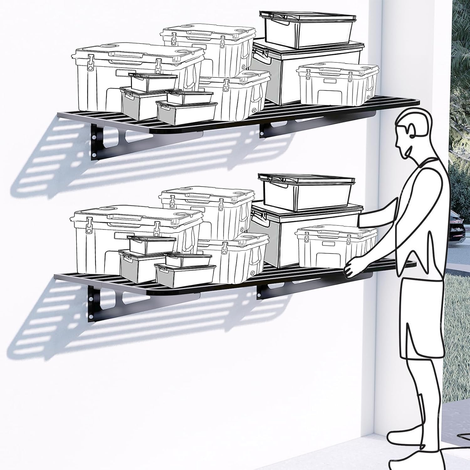 - 【Garage Shelving】: Includes a 2-pack of wall mounted garage shelves, each measuring 24 x 48'IN, perfect for holding storage bins, boxes, sporting goods, tools, and more. say goodbye to cluttered garage space storage.