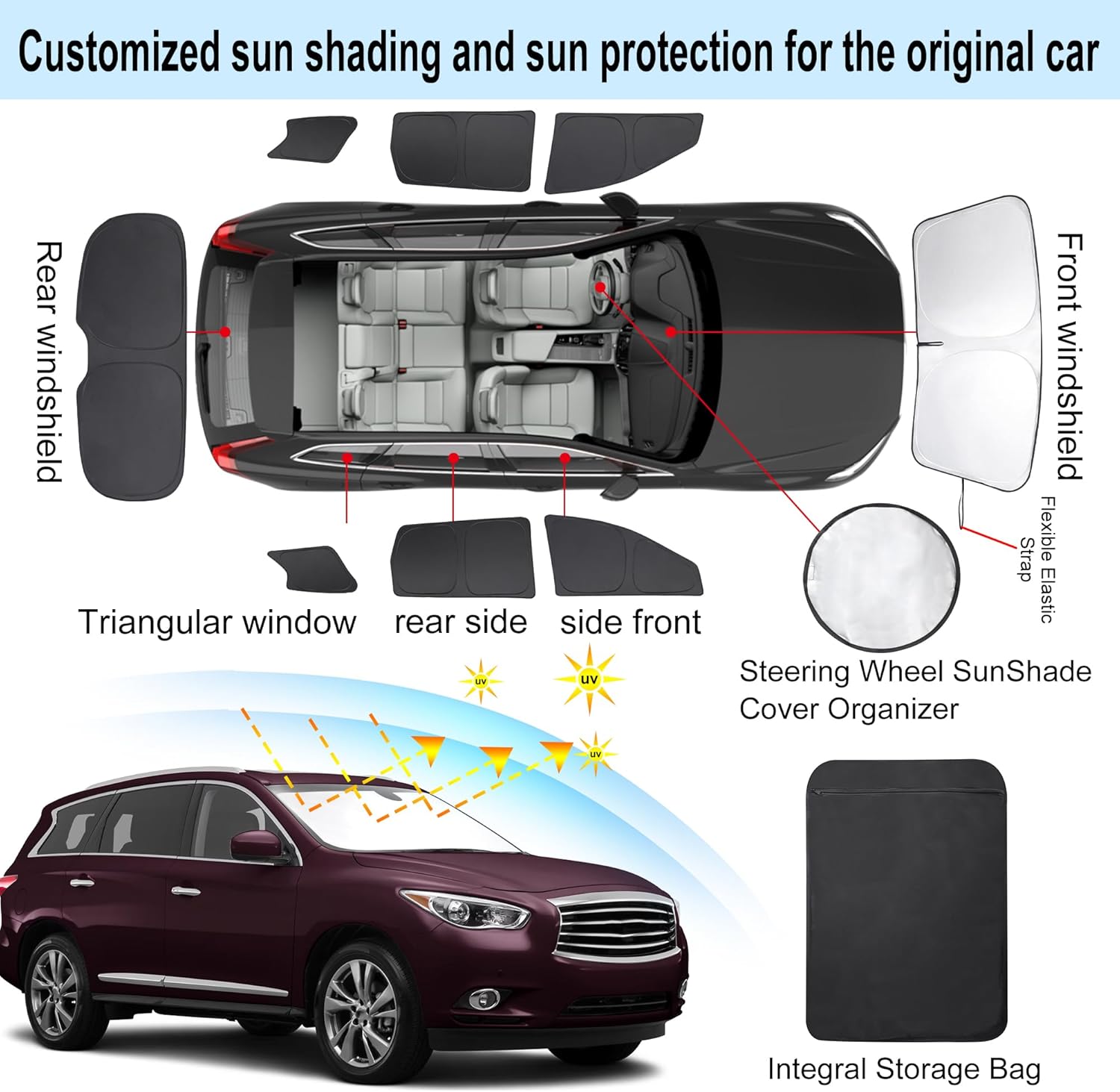 - Customized Design:The sun shade custom fit for Infiniti QX60 2014-2021.Our window shade is according to the car size design,perfectly fit your car and does not need to trim.windshield sun shade solve the problem of light leakage and incompatibility of the old umbrellas.The sunshade designed for Infiniti QX60.