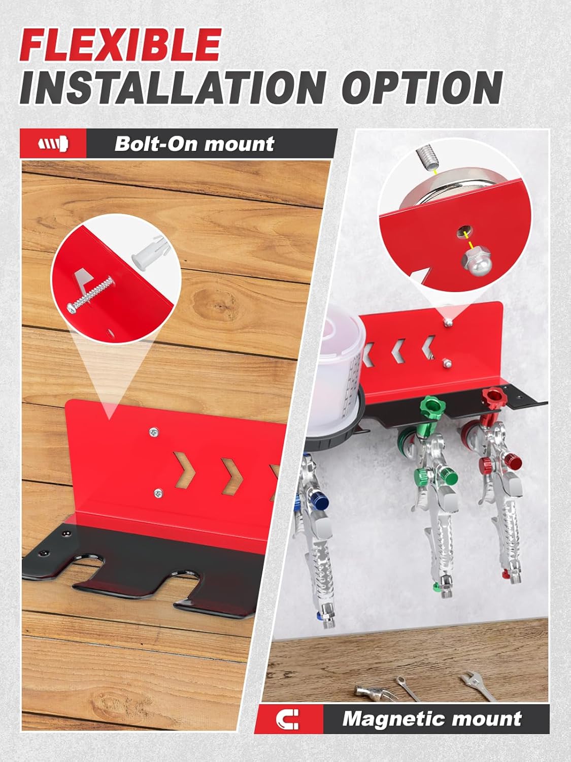 - Organized Tool Storage: Stores up to 7 gravity feed spray guns without cups, or 4 with cups. The open design keeps your tools visible, accessible, and neatly lined up—making every paint job smoother from start to finish