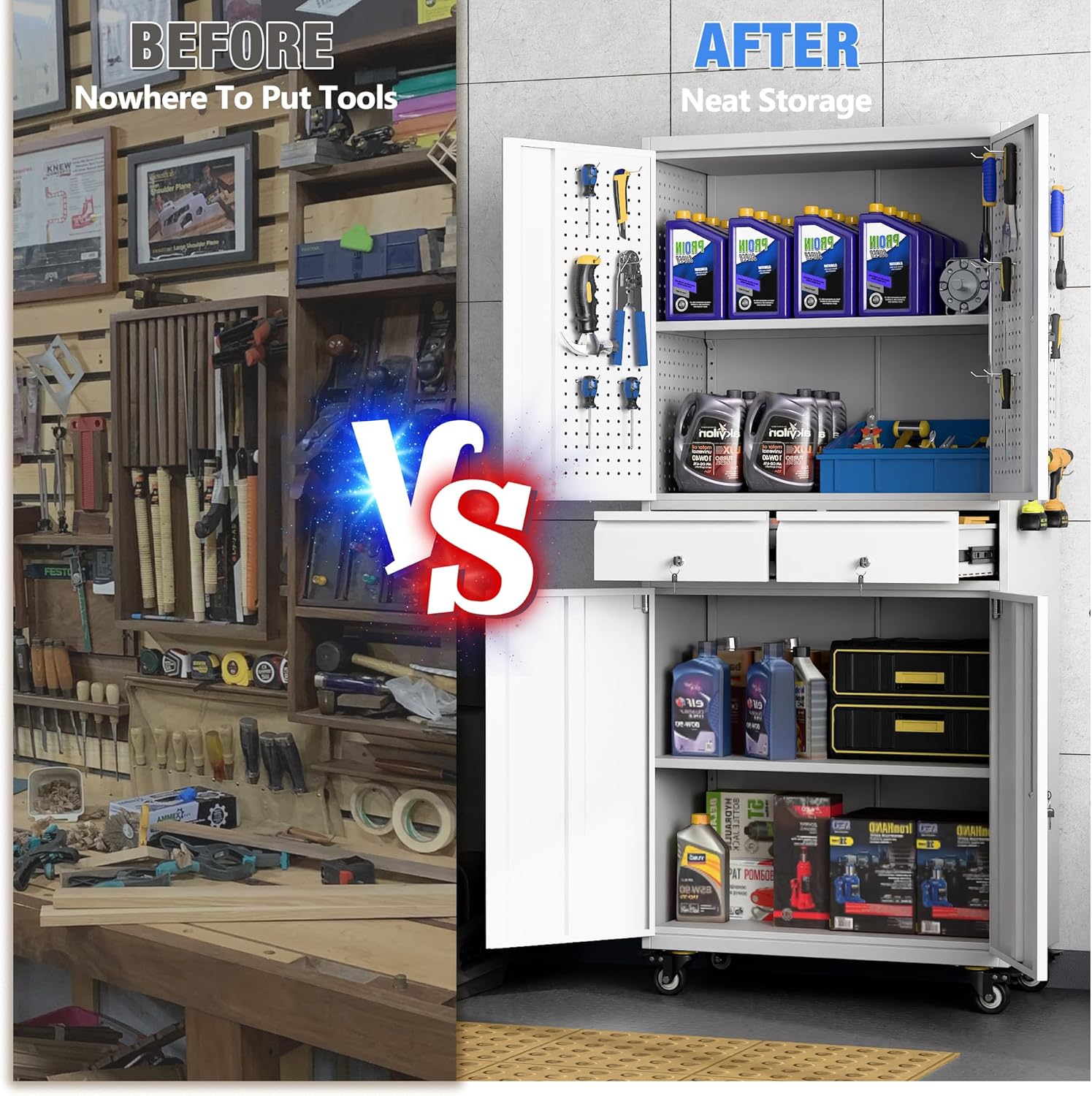 - Utility Pegboard & Adjustable Shelves: Redesign your organizing ways, hang up everything on the door and the side, get effortless accessible for a variety of small hardware, no more searching for things among the clutter. Tall Garage storage cabinet with wheels is designed with 2 adjustable shelves, you can easily meet your different storage needs by adjusting the height between the shelves.