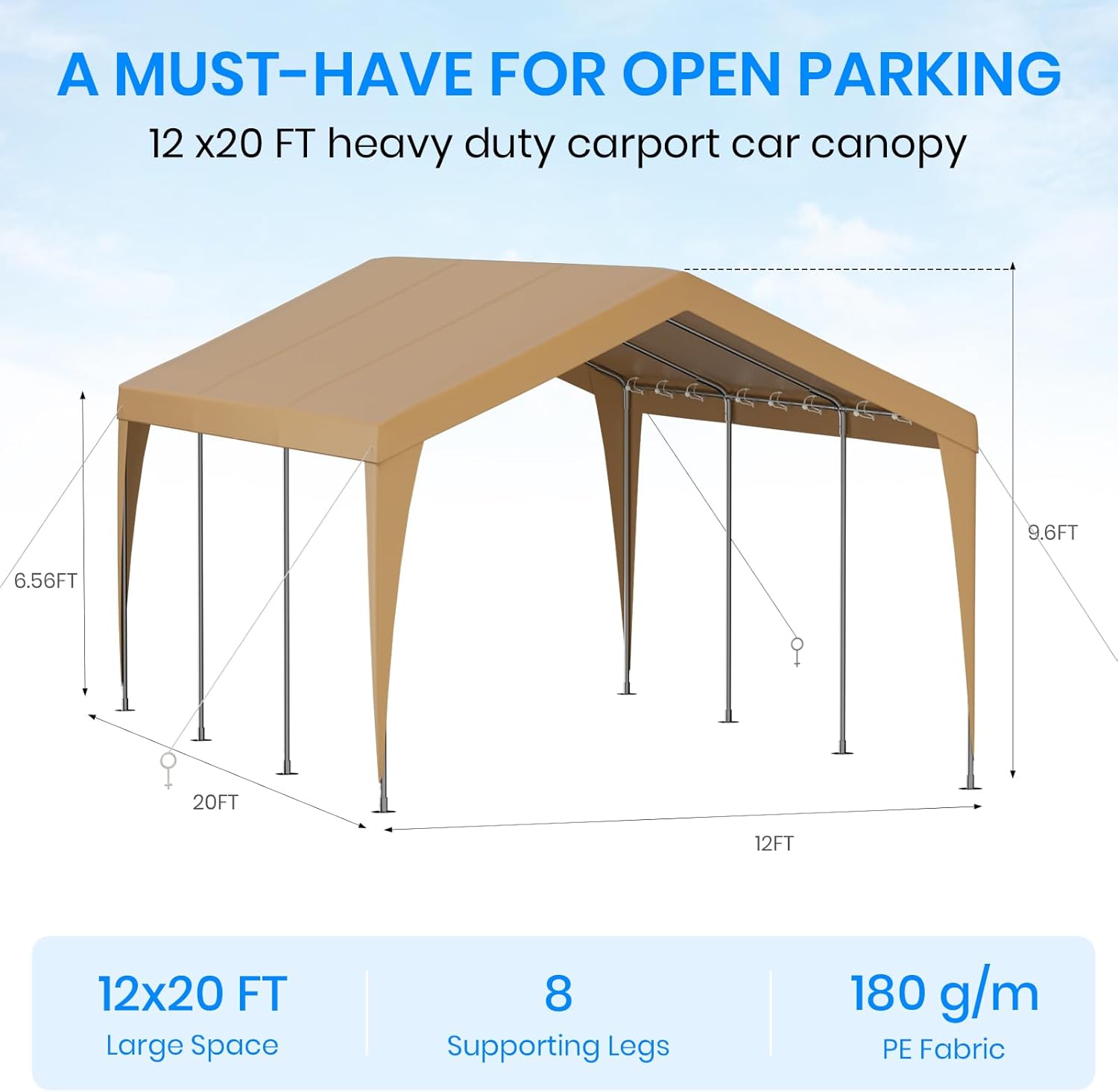 - 【Heavy Duty Stability Frame with 8 Legs】-This carport shelter is constructed with a heavy-duty rust-resistant galvanized steel frame that prevents rust, and corrosion. Featuring 8 legs comprising thick steel poles, along with 4 sturdy windproof ropes and 16 ground stakes make the whole metal carport 12x20 more stable and can be safe from harsh weather conditions