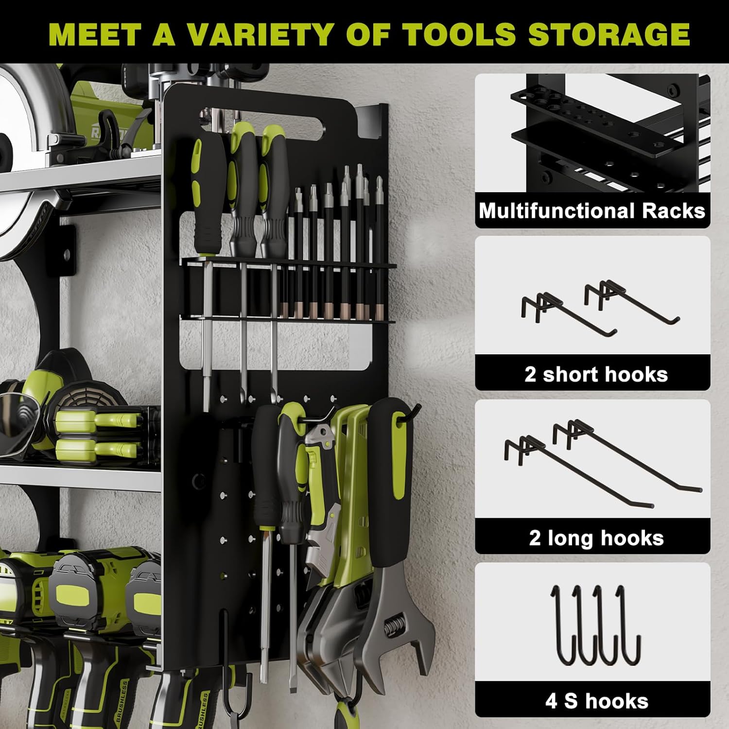 - Ample Storage Space for Power Tools: This Power Tool Organizer Wall Mount offers expansive storage, allowing you to hang up to 16 electric tools at once. Perfect for organizing drills, cordless tools, and other heavy-duty power tools, keeping your workspace clean and clutter-free