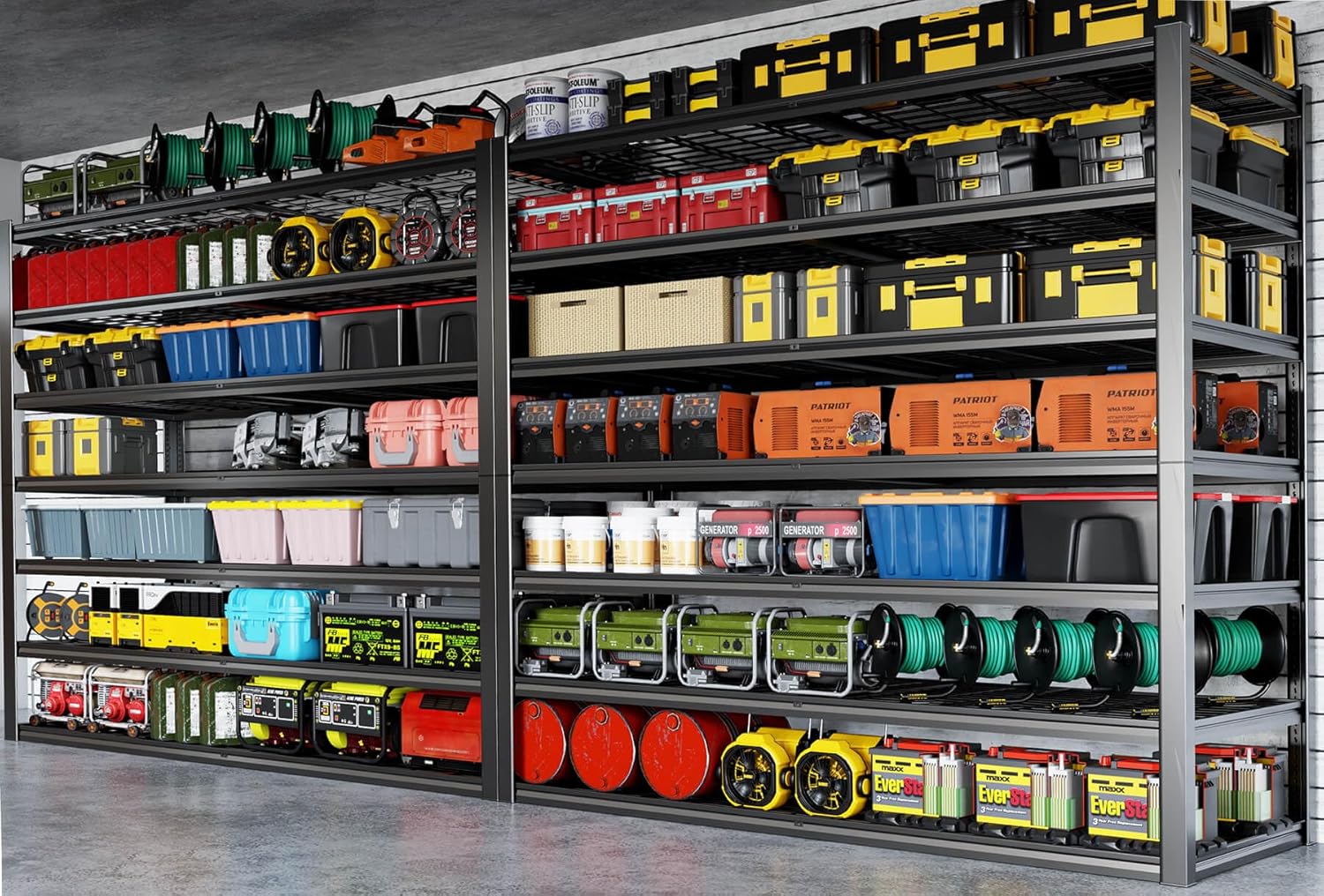 - 【Adjustable Heavy Duty Metal Shelves to Meet Different Needs】The height of each tier can be adjusted not only by moving the crossbar to meet the needs of different heights, but also the shelves can be assembled or disassembled into a variety of different metal shelves. The 96-inch tall 3500 lb. load-bearing garage shelves are not only strong, but they also give you more storage space.