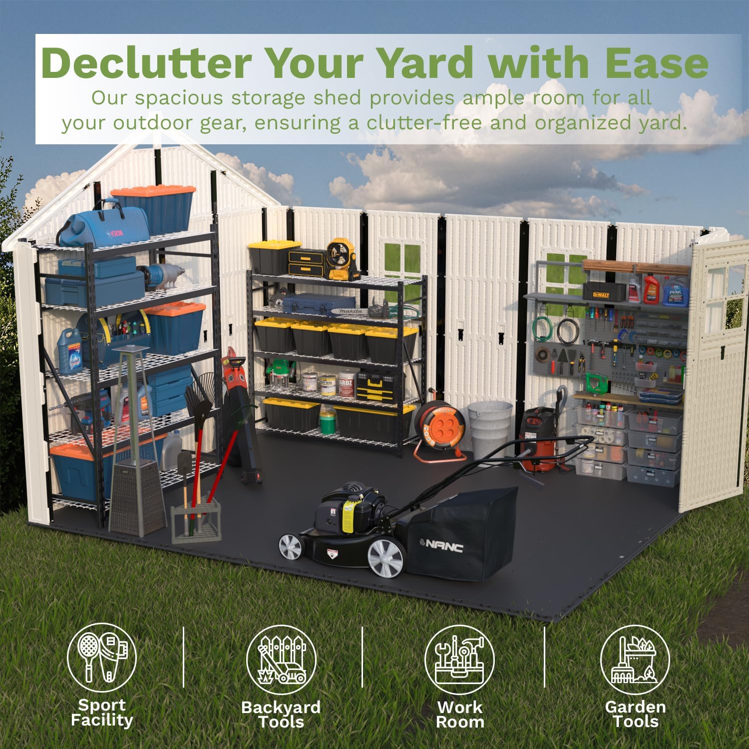 - All-Season Security: Lockable double doors and reinforced resin shield valuables from weather and intruders. Waterproof construction and UV-resistant materials defend against rain, humidity, and fading.