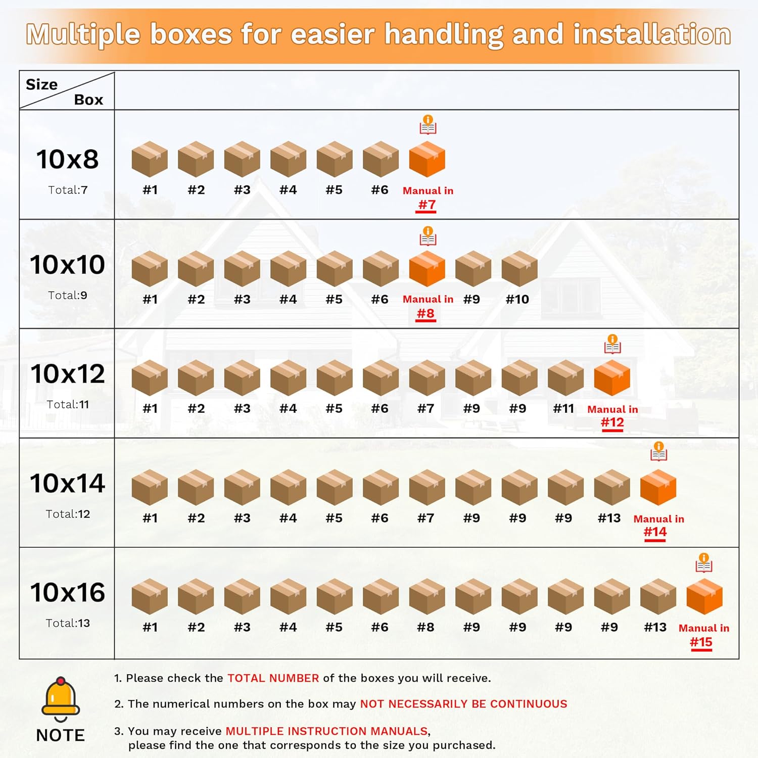 - Note: 1. Please check the policies of your community's homeowners association (HOA) to ensure that this project complies with relevant regulations. 2. The storage shed will be divided into 11 packages, which may be delivered in batches. The box numbers are 1, 2, 3, 4, 5, 6, 7, 9, 11, and 12. There are two boxes with the number 9. You can scan the QR code on the package or contact us. You will receive 2 instruction manuals. Please refer to the manual in the 12th box.