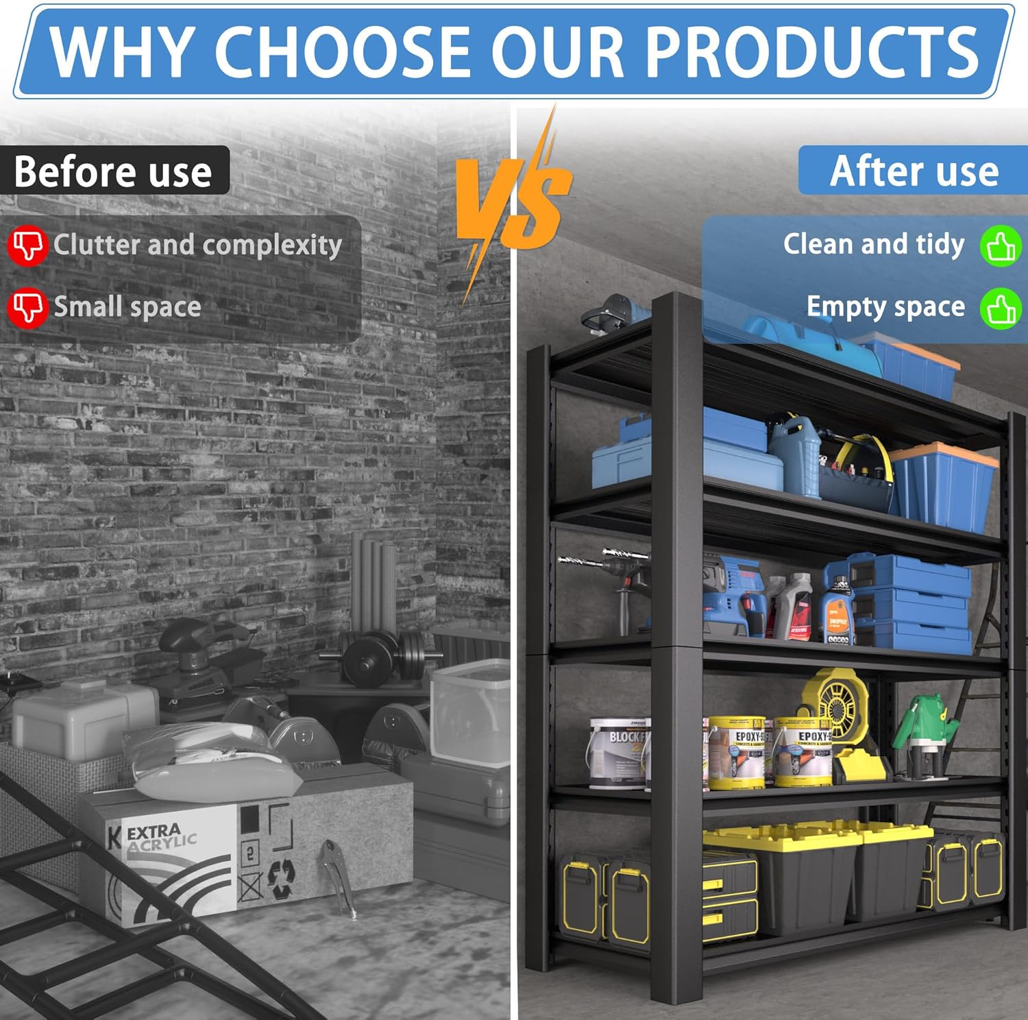- Versatile for Any Space & User: This metal shelving unit declutters and organizes any area where you need storage. It's ideal for the garage, workshop, basement, pantry, utility room, or warehouse – holding tools, supplies, and household items with ease. Perfect for DIYers, mechanics, homeowners, renters, and handymen seeking a dependable storage solution.