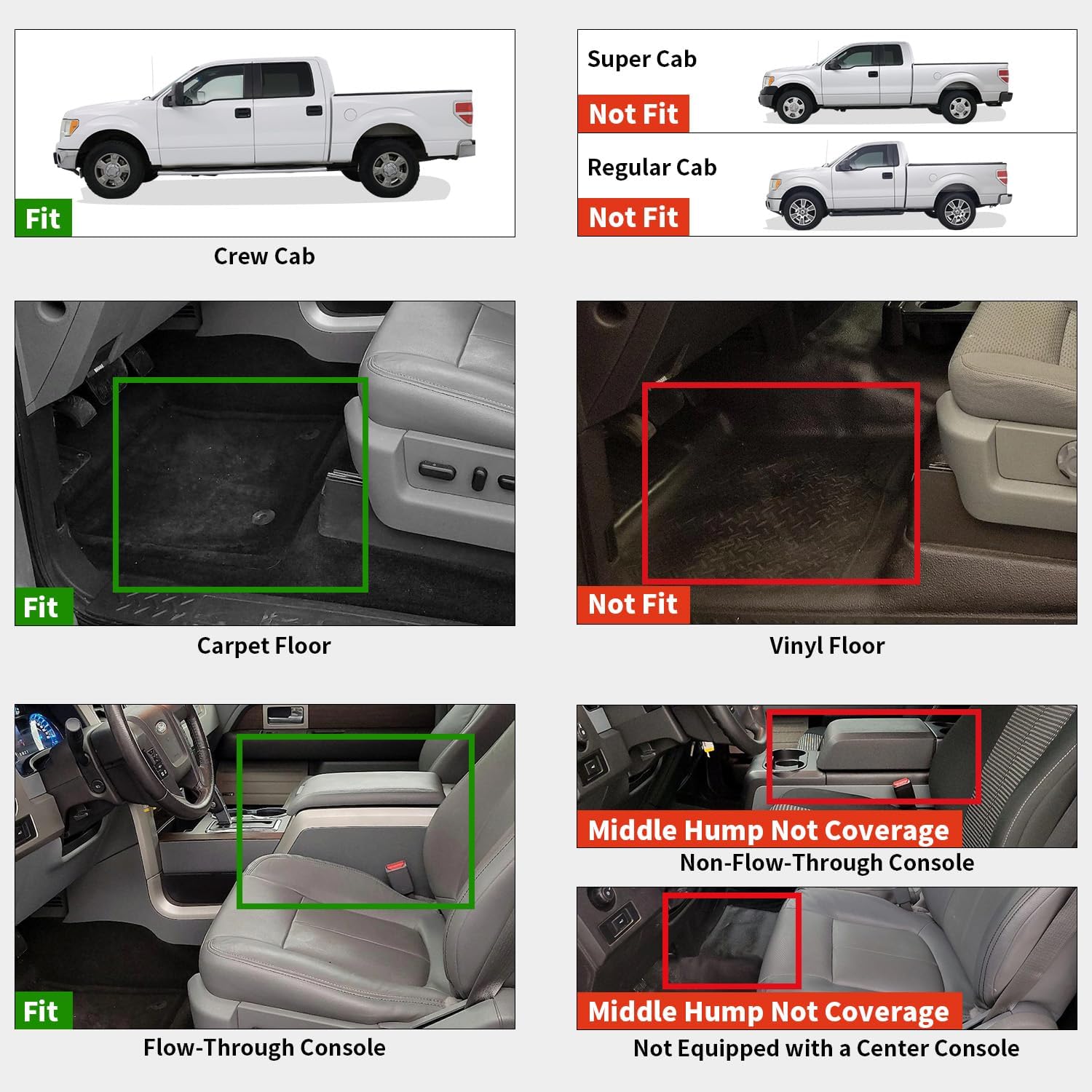 - FIT LIKE A GOLVE - LASFIT Floor Mats Custom fit for Ford F150 2011-2014 Super Crew Cab, Carpet Floor Front Row w/ Flow-Through Console, precisely designed using 3D scanning technology to a vehicle specific fit, providing full coverage and protection for the driver, passenger, include the areas under the gas and brake pedals, the edges of the seat slide rails