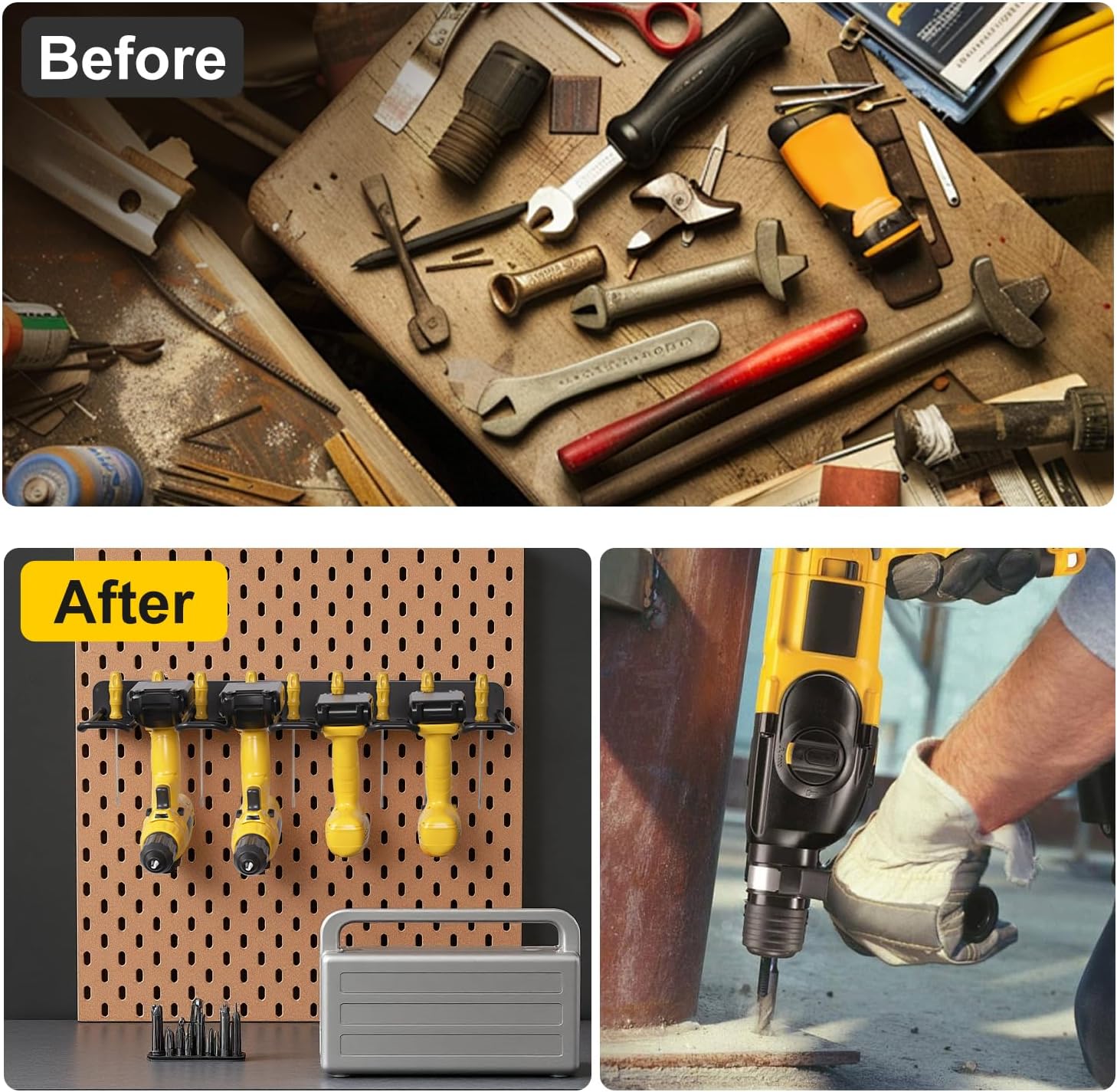 - SPACE-SAVING STORAGE SOLUTION : Converts cluttered walls or benches into a neatly organized workspace with dedicated slots for drills, screwdrivers, and accessories.