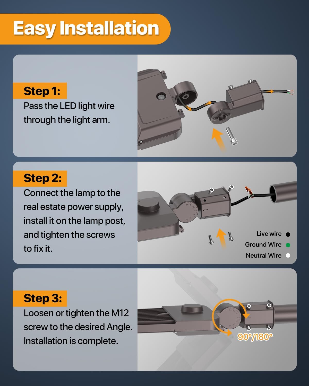 - ADJUSTABLE SLIP FITTER MOUNT: Compatible with round poles, adjustable from 0° to 180° for precise light direction. Hardware and instructions included for easy setup