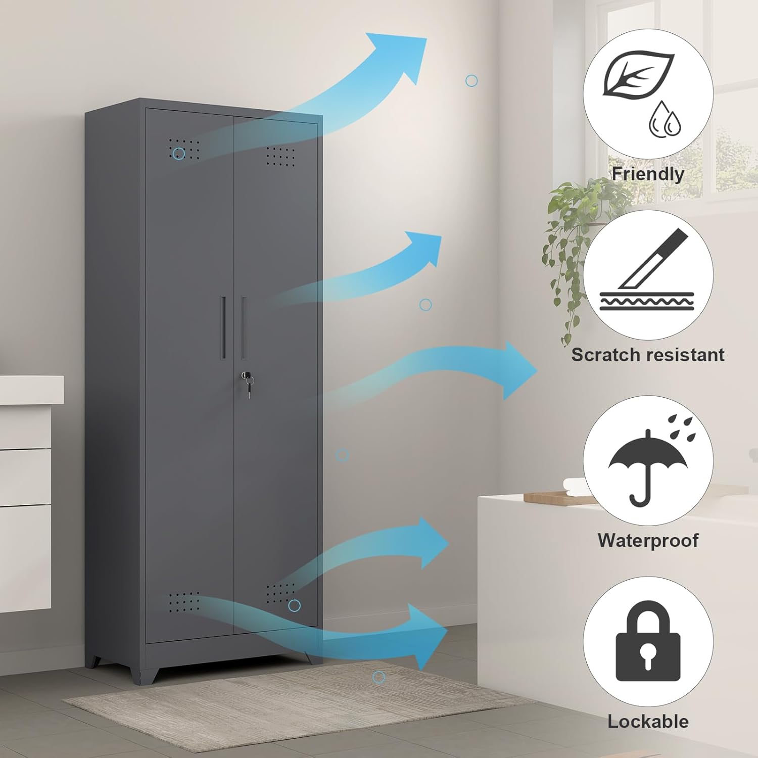 - 【User-Friendly Design】The bottom of the broom metal cabinets with locking doors and adjustable Shelves is made of stainless steel, which is corrosion-resistant and easy to clean. The ventilation holes on the panel prevent moisture and allow breathability, keeping the interior dry and reducing odors. The four standing feet enhance the stability of the cabinet and make it easier to clean underneath.