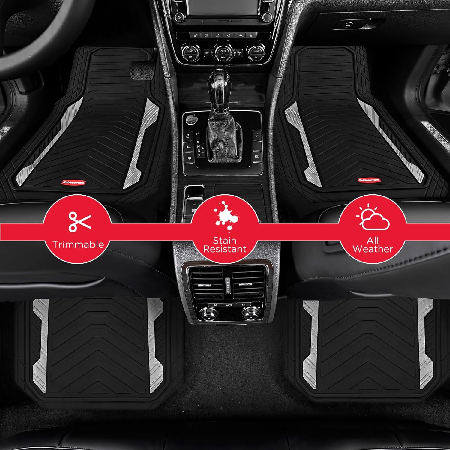Rubbermaid Car Floor Mat, Heavy Duty All-Weather Car Mats Full Set with Dual-Tone Sliver Aluminum Inserts – Universal Fit, Anti-Slip Backing, Trim-to-Fit for Most SUV, Sedan, Van