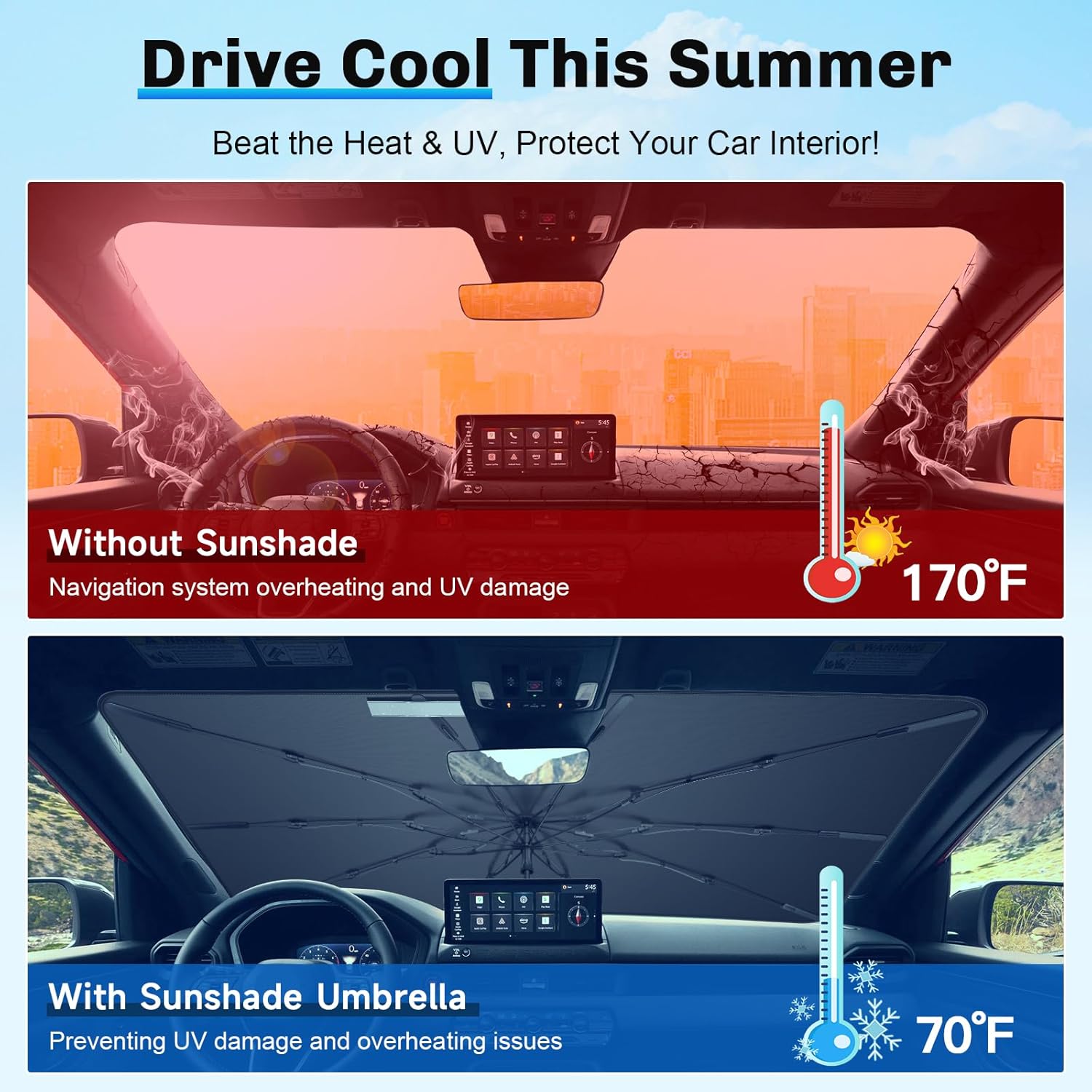 - 3. Enhanced Durability and Stability: Our 2024 2025 Passport Windshield Umbrella uses 10 glass fiber ribs for high strength, heat resistance, and anti-rust performance. Silicone strips withstand 200°C, ensuring durable shade and interior protection