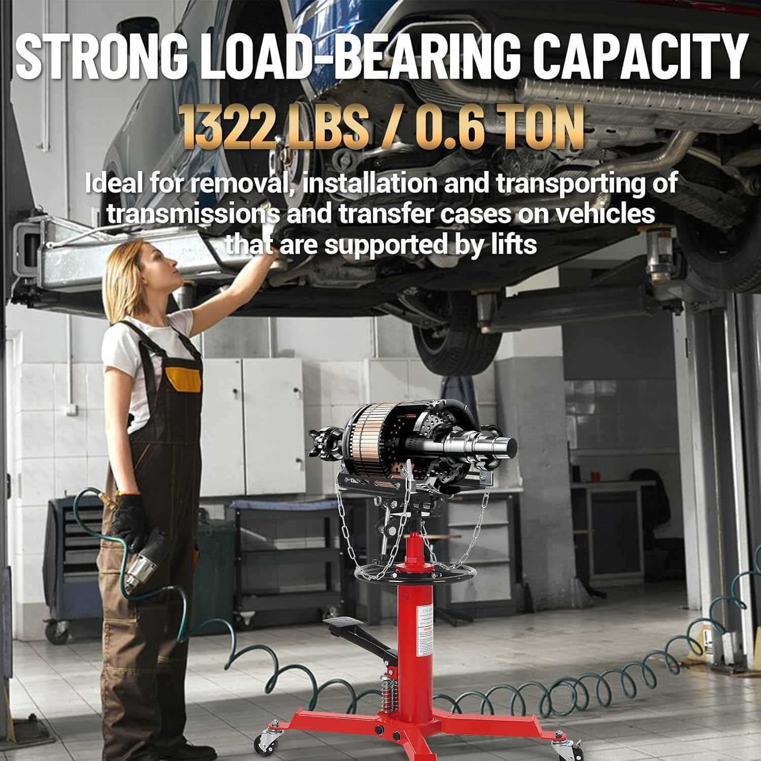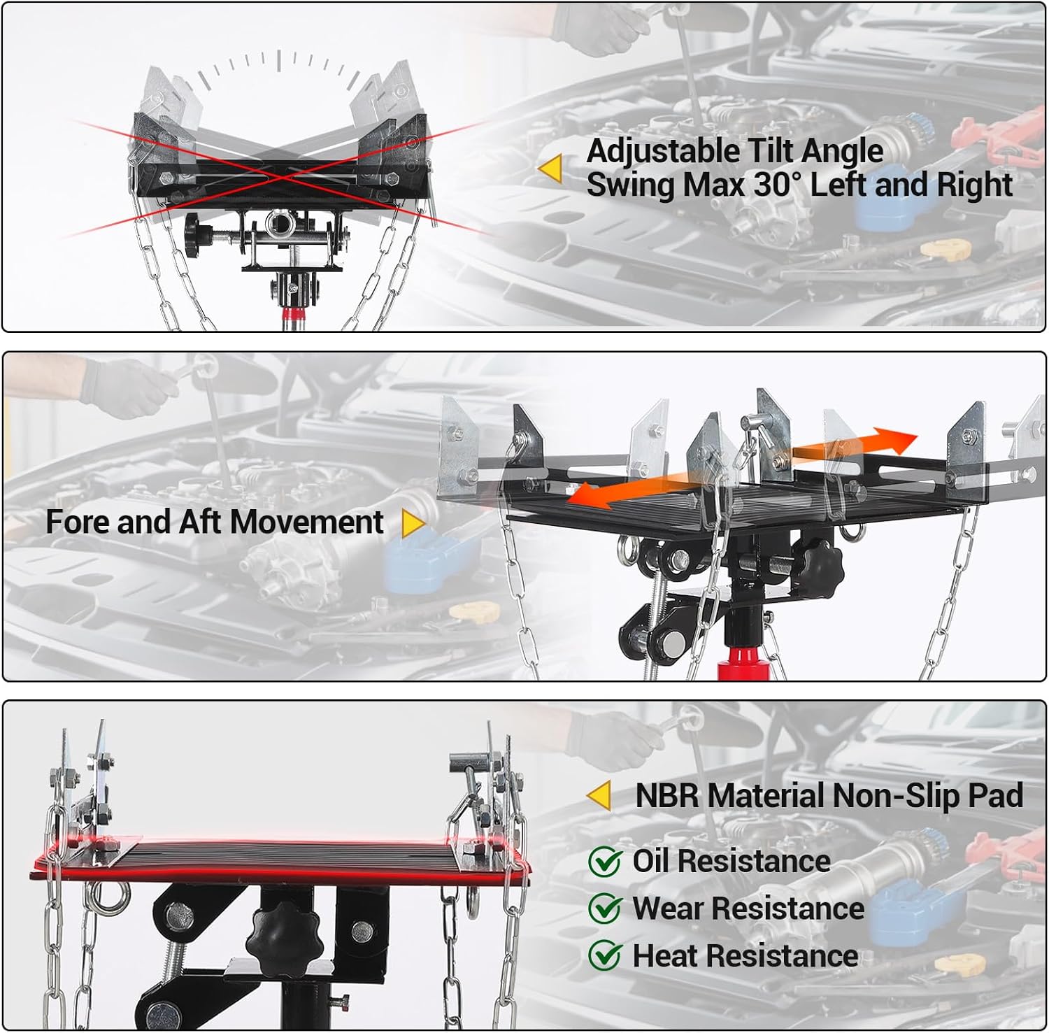 - 【1322 LBS Load Capacity】- This hydraulic transmission jack is engineered from robust carbon steel, ensuring exceptional durability and strength, and maximum load capacity is up to 1322lbs. Its wide base provides enhanced stability, while the two heavy-duty safety anchor chains securely hold the load in place, allowing for safe and efficient transmission service. In addition, it comes with an 8MM thick anti-slip pad to ensure safe load.