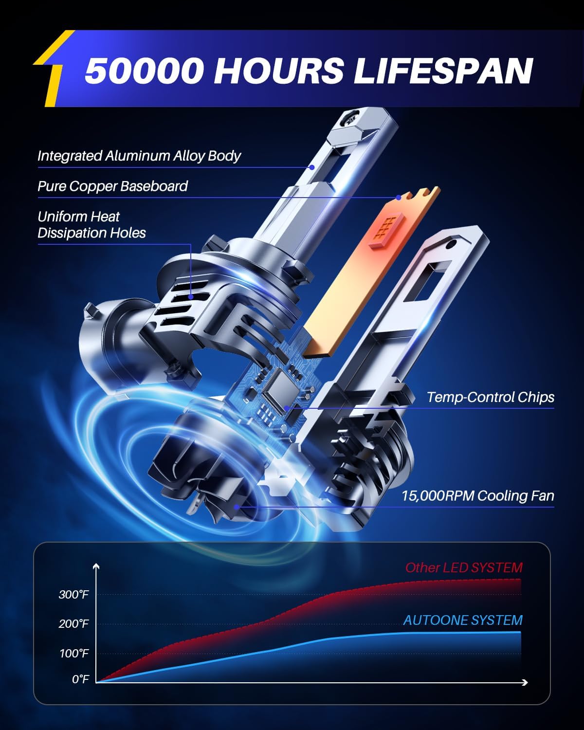 - Durable 60000h Life: The design of the radiator plus the supercooling capacity provided by the 15,000RPM turbo cooling fan. Cool down quickly when working hence no overheat for the h11/h9 hb3/9005 led light. Which ensure its lifespan more than 6 years