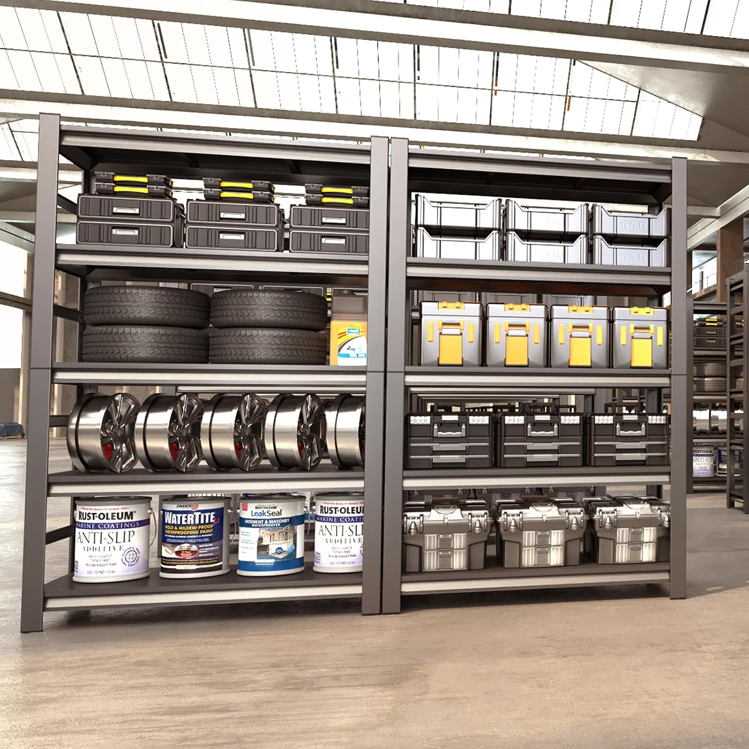 - 【Extremely Sturdy & Durable Garage Shelving】Constructed from high-strength premium cold-rolled steel with advanced powder-coated technology, this metal shelving unit resists rust, oxidation, and wear. The industrial-grade coating not only enhances aesthetics but also boosts durability, making it a heavy-duty shelving solution for long-term use