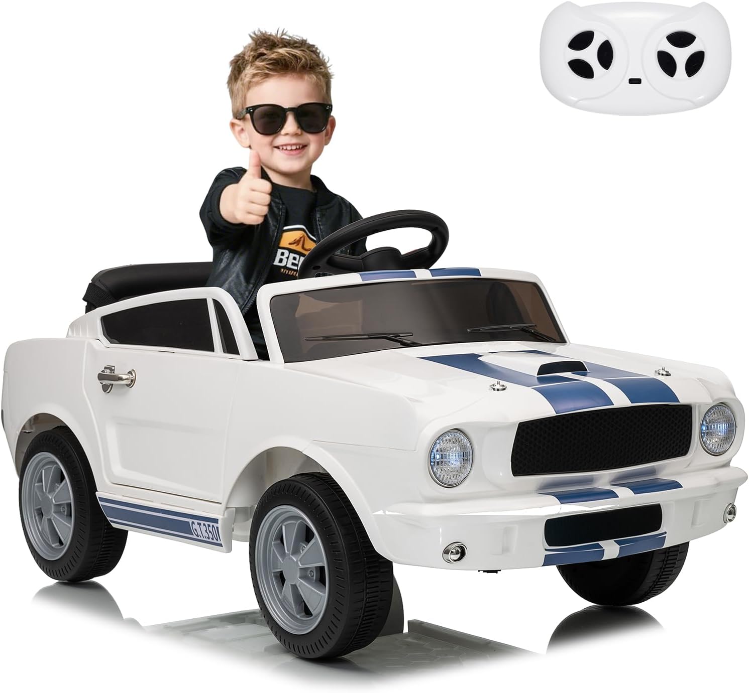 12V Ride on Car Licensed Shelby GT350, Battery Powered Ride On Toy for Toddlers with Remote Control, Electric Car for Kids, Bluetooth, Shock Absorbers, Safety Belt, 3 Speeds, LED Lights, Music, White