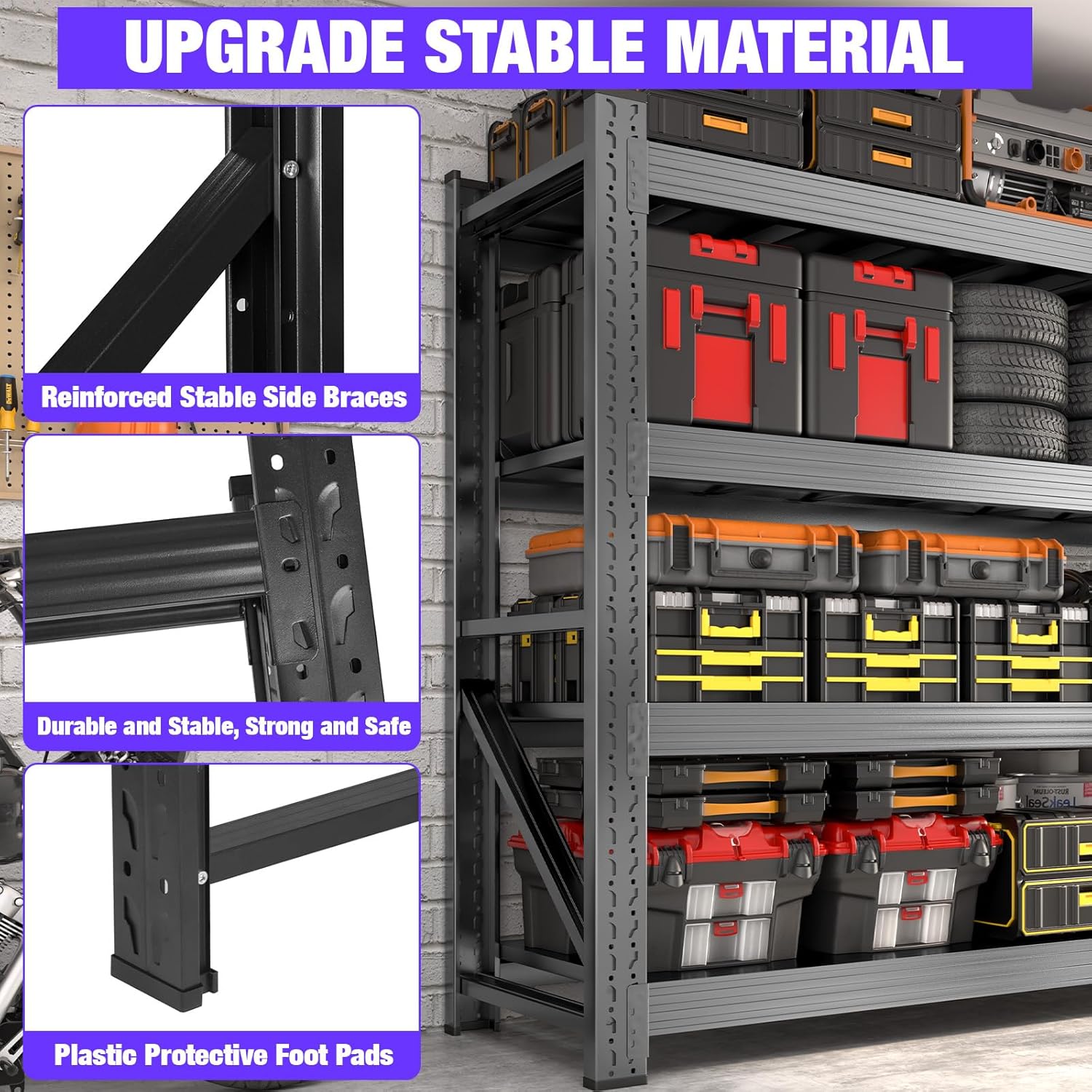 - 【Adjustable Storage Spacing】You can adjust our storage shelves by moving the crossbar to suit the different heights you need. Our garage shelving can be used in many ways. They can help you tidy up your garage and make it more organised.